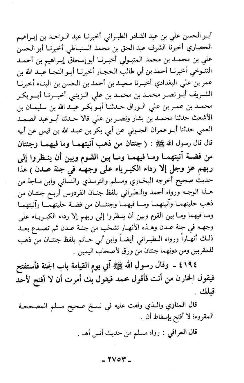 أبو الحسن علي بن عبد القادر الطبراني أخبرنا عبد الواحد بن إبراهيم الحصاري أخبرنا الشرف عبد الحق بن محمد السنباطي أخبرنا أبو الحسن علي بن محمد بن محمد المتبولي أخبرنا أبو إسحاق إبراهيم بن أحمد التنوخي أخبرنا أحمد بن أبي طالب الحجار أخبرنا أبو النجا عبد الله بن عمر بن علي البغدادي أخبرنا سعيد بن أحمد بن الحسن بن البناء أخبرنا الشريف أبو نصر محمد بن محمد بن علي الزينبي أخبرنا أبو بكر محمد بن عمر بن علي الوراق حدثنا أبو بكر عبد الله بن سليمان بن الأشعث حدثنا محمد بن بشار ونصر بن علي قالا حدثنا أبو عبد الصمد العمي حدثنا أبو عمران الجوني عن أبي بكر بن عبد الله بن قيس عن أبيه قال قال رسول الله - صلّى الله عليه وسلم -: (جنتان من ذهب آنيتهما وما فيهما وجنتان من فضة آنيتهما وما فيهما وما بين القوم وبين أن ينظروا إلى ربهم عز وجل إلا رداء الكبرياء على وجهه في جنة عدن) هذا حديث صحيح أخرجه البخاري ومسلم والترمذي والنسائي وابن ماجة من هذا الوجه ورواه أحمد والطبراني بلفظ جنان الفردوس أربع جنتان من ذهب حليتهما وآنيتهما وما فيهما وجنتان من فضة حليتهما وآنيتهما وما فيهما وما بين القوم وبين أن ينظروا إلى ربهم إلا رداء الكبرياء على وجهه في جنة عدن وهذه الأنهار تشخب من جنة عدن ثم تصدع بعد ذلك أنهاراً ورواه الطبراني أيضاً وابن أبي حاتم بلفظ جنتان من ذهب للمقربين ومن دونهما جنتان من ورق لأصحاب اليمين.
