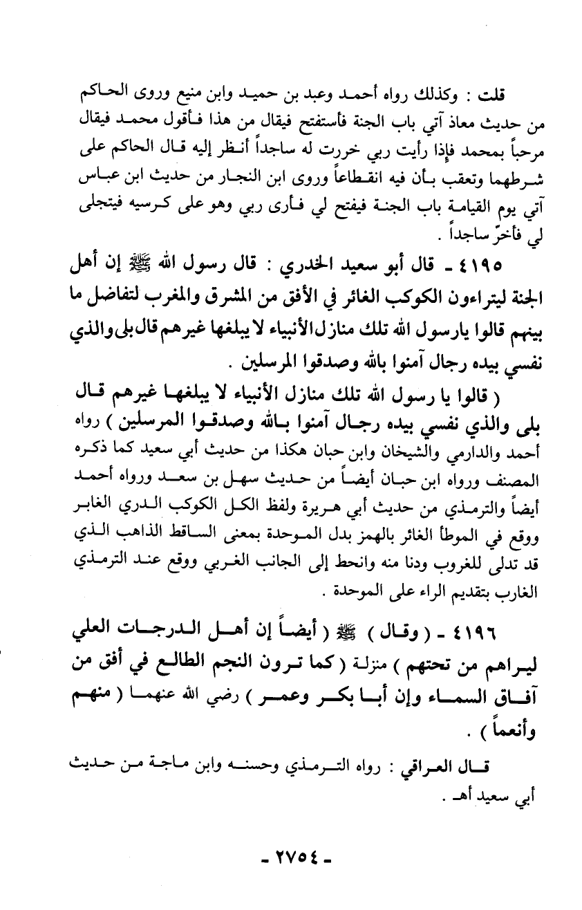 4195 - قال أبو سعيد الخدري: قال رسول الله - صلّى الله عليه وسلم - إن أهل الجنة ليتراءون الكوكب الغائر في الأفق من المشرق والمغرب لتفاضل ما بينهم قالوا يا رسول الله تلك منازل الأنبياء لا يبلغها غيرهم قال بلى والذي نفسي بيده رجال آمنوا بالله وصدقوا المرسلين.