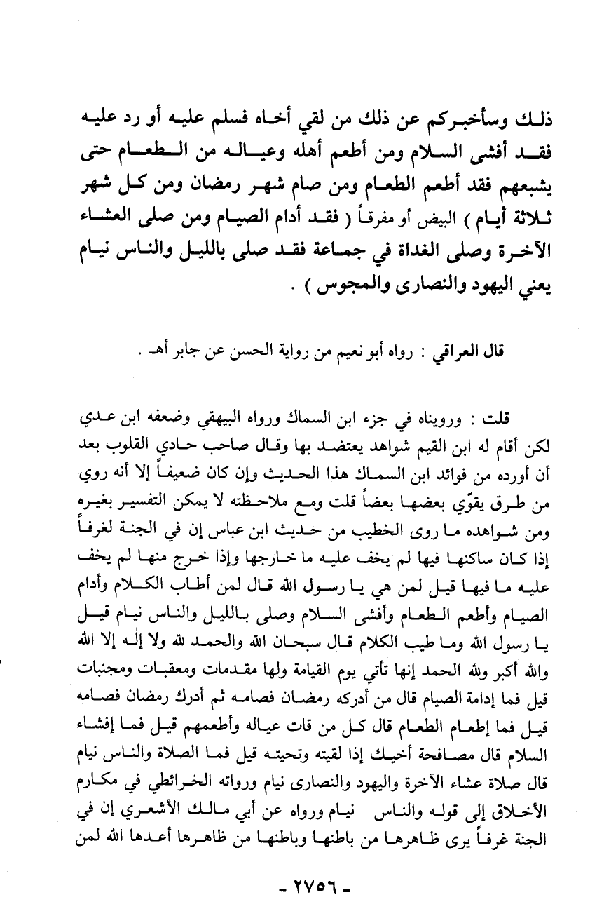 قلت: ورويناه في جزء ابن السماك ورواه البيهقي وضعفه ابن عدي لكن أقام له ابن القيم شواهد يعتضد بها وقال صاحب حادي القلوب بعد أن أورده من فوائد ابن السماك هذا الحديث وإن كان ضعيفاً إلا أنه روي من طرق يقوّي بعضها بعضاً قلت ومع ملاحظته لا يمكن التفسير بغيره ومن شواهده ما روى الخطيب من حديث ابن عباس إن في الجنة لغرفاً إذا كان ساكنها فيها لم يخف عليه ما خارجها وإذا خرج منها لم يخف عليه ما فيها قيل لمن هي يا رسول الله قال لمن أطاب الكلام وأدام الصيام وأطعم الطعام وأفشى السلام وصلى بالليل والناس نيام قيل يا رسول الله وما طيب الكلام قال سبحان الله والحمد لله ولا إله إلا الله والله أكبر ولله الحمد إنها تأتي يوم القيامة ولها مقدمات ومعقبات ومجنبات قيل فما إدامة الصيام قال من أدركه رمضان فصامه ثم أدرك رمضان فصامه قيل فما إطعام الطعام قال كل من قات عياله وأطعمهم قيل فما إفشاء السلام قال مصافحة أخيك إذا لقيته وتحيته قيل فما الصلاة والناس نيام قال صلاة عشاء الآخرة واليهود والنصارى نيام ورواته الخرائطي في مكارم الأخلاق إلى قوله والناس نيام ورواه عن أبي مالك الأشعري إن في الجنة غرفاً يرى ظاهرها من باطنها وباطنها من ظاهرها أعدها الله لمن