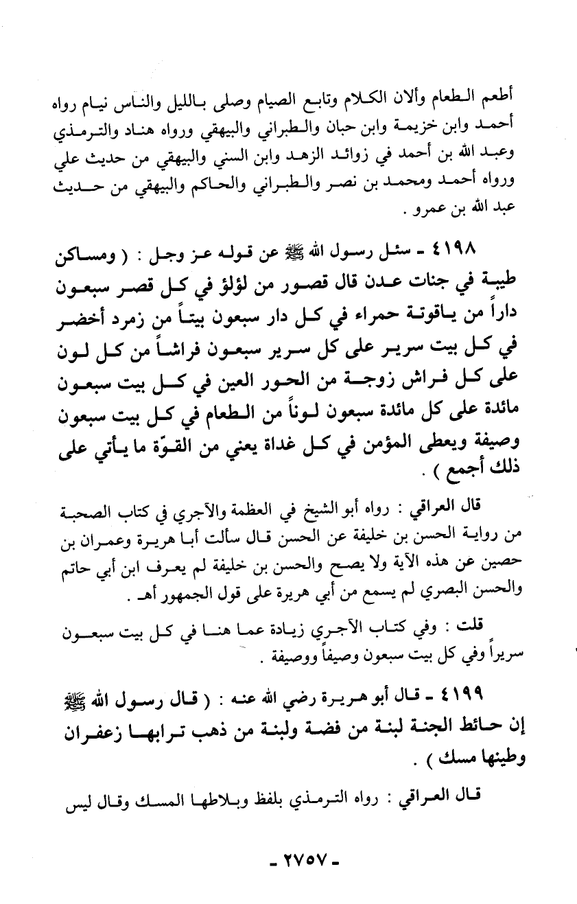 4199 - قال أبو هريرة رضي الله عنه: (قال رسول الله - صلّى الله عليه وسلم - إن حائط الجنة لبنة من فضة ولبنة من ذهب ترابها زعفران وطينها مسك).