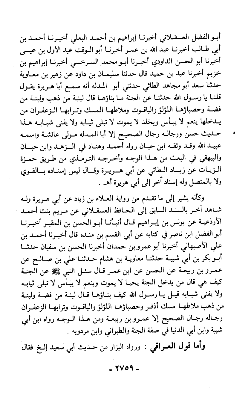 أبو الفضل العسقلاني أخبرنا إبراهيم بن أحمد البعلي أخبرنا أحمد بن أبي طالب أخبرنا عبد الله بن عمر أخبرنا أبو الوقت عبد الأول بن عيسى أخبرنا أبو الحسن الداودي أخبرنا أبو محمد السرخسي أخبرنا إبراهيم بن خزيم أخبرنا عبد بن حميد قال حدثنا سليمان بن داود عن زهير بن معاوية حدثنا سعد أبو مجاهد الطائي حدثني أبو المدله أنه سمع أبا هريرة يقول قلنا يا رسول الله حدثنا عن الجنة ما بناؤها قال لبنة من ذهب ولبنة من فضة وحصباؤها اللؤلؤ والياقوت وملاطها المسك وترابها الزعفران من يدخلها ينعم لا يبأس ويخلد لا يموت لا تبلى ثيابه ولا يفنى شبابه هذا حديث حسن ورجاله رجال الصحيح إلا أبا المدله مولى عائشة واسمه عبيد الله وقد وثقه ابن حبان رواه أحمد وهناد في الزهد وابن حبان والبيهقي في البعث من هذا الوجه وأخرجه الترمذي من طريق حمزة الزيات عن زياد الطائي عن أبي هريرة وقال ليس إسناده بالقوي ولا بالمتصل وله إسناد آخر إلى أبي هريرة أهـ.