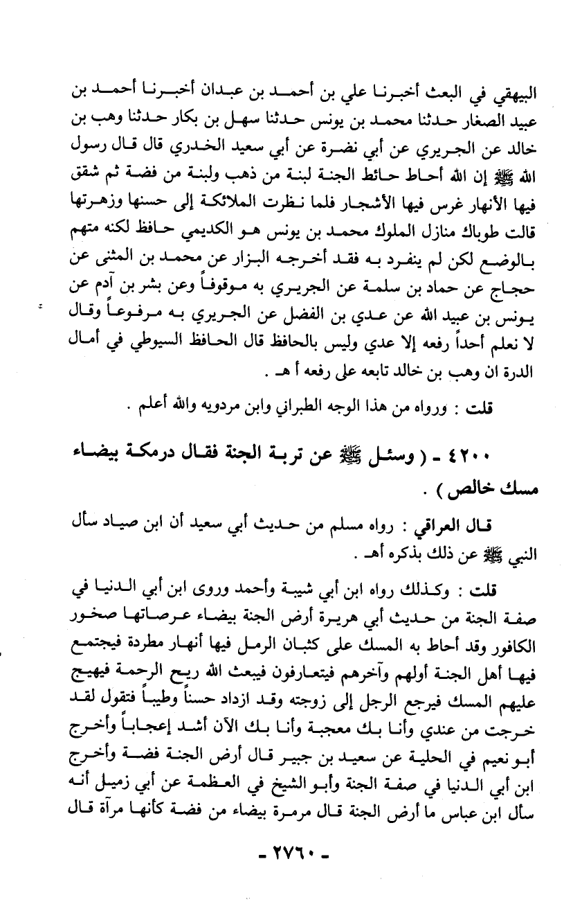 4200 - (وسئل - صلّى الله عليه وسلم - عن تربة الجنة فقال درمكة بيضاء مسك خالص).
