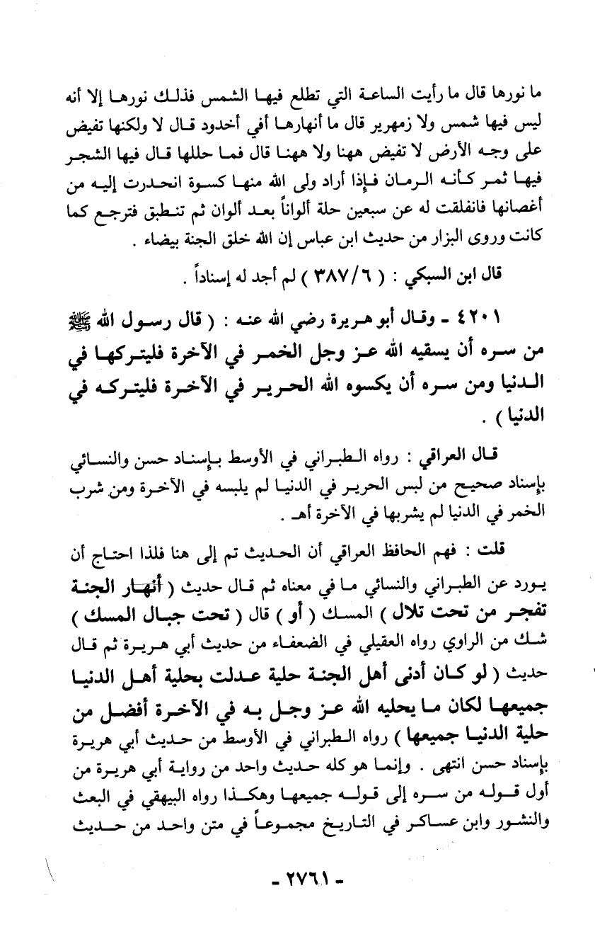4201 - وقال أبو هريرة رضي الله عنه: (قال رسول الله - صلّى الله عليه وسلم - من سره أن يسقيه الله عز وجل الخمر في الآخرة فليتركها في الدنيا ومن سره أن يكسوه الله الحرير في الآخرة فليتركه في الدنيا).
