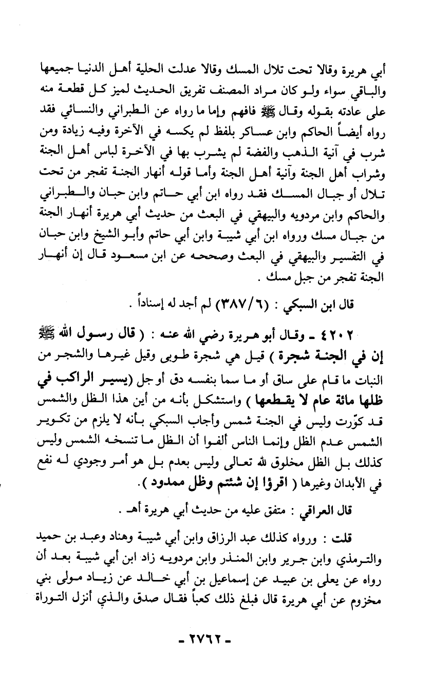 4202 - وقال أبو هريرة رضي الله عنه: (قال رسول الله - صلّى الله عليه وسلم - إن في الجنة شجرة) قيل هي شجرة طوبى وقيل غيرها والشجر من النبات ما قام على ساق أو ما سما بنفسه دق أو جل (يسير الراكب في ظلها مائة عام لا يقطعها) واستشكل بأنه من أين هذا الظل والشمس قد كوّرت وليس في الجنة شمس وأجاب السبكي بأنه لا يلزم من تكوير الشمس عدم الظل وإنما الناس ألفوا أن الظل ما تنسخه الشمس وليس كذلك بل الظل مخلوق لله تعالى وليس بعدم بل هو أمر وجودي له نفع في الأبدان وغيرها (اقرؤا إن شئتم وظل ممدود).