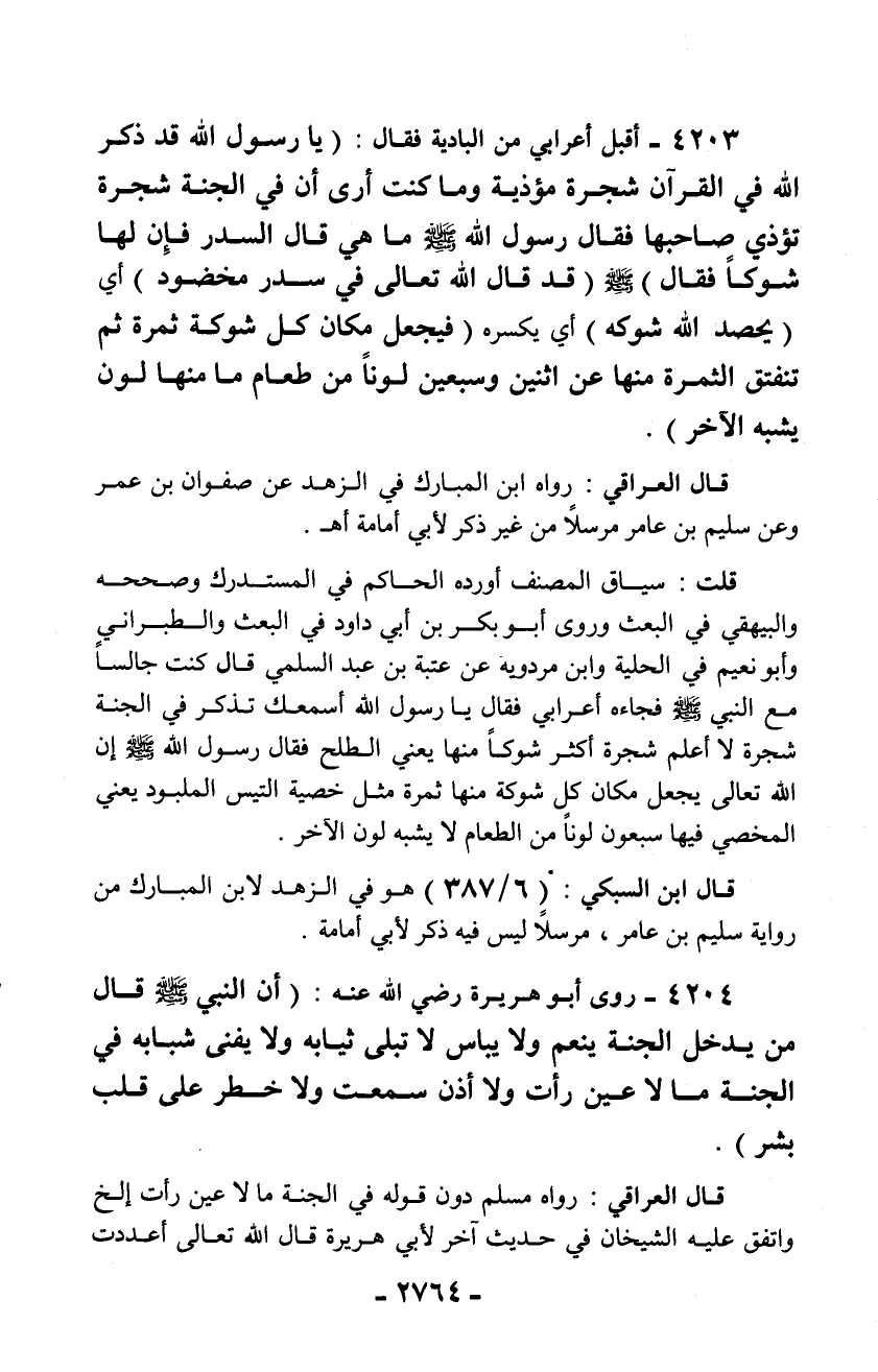4203 - أقبل أعرابي من البادية فقال: (يا رسول الله قد ذكر الله في القرآن شجرة مؤذية وما كنت أرى أن في الجنة شجرة تؤذي صاحبها فقال رسول الله - صلّى الله عليه وسلم - ما هي قال السدر فإن لها شوكاً فقال) - صلّى الله عليه وسلم - (قد قال الله تعالى في سدر مخضود) أي (يحصد الله شوكه) أي يكسره (فيجعل مكان كل شوكة ثمرة ثم تنفتق الثمرة منها عن اثنين وسبعين لوناً من طعام ما منها لون يشبه الآخر).