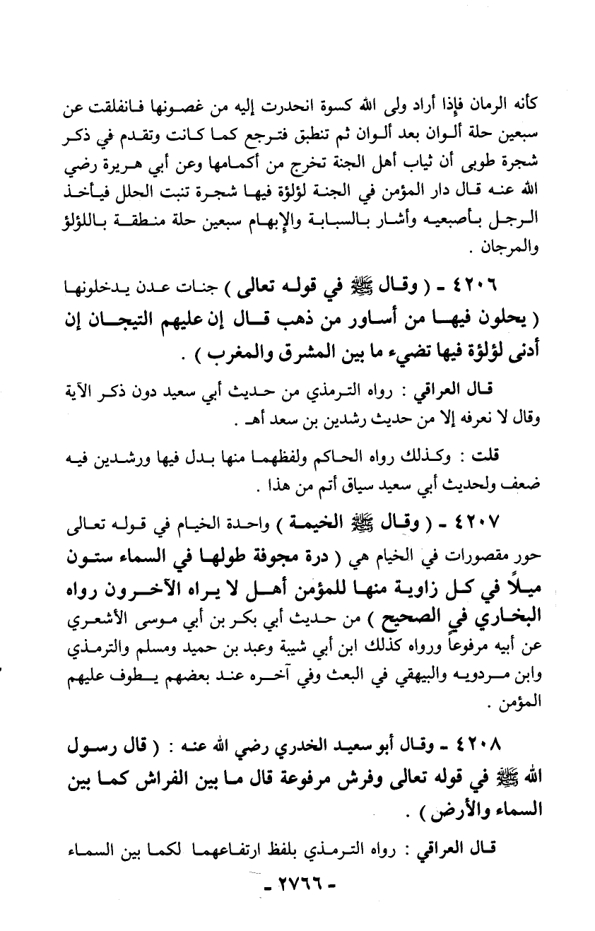 4206 - (وقال - صلّى الله عليه وسلم - في قوله تعالى) جنات عدن يدخلونها (يحلون فيها من أساور من ذهب قال إن عليهم التيجان إن أدنى لؤلؤة فيها تضيء ما بين المشرق والمغرب).
