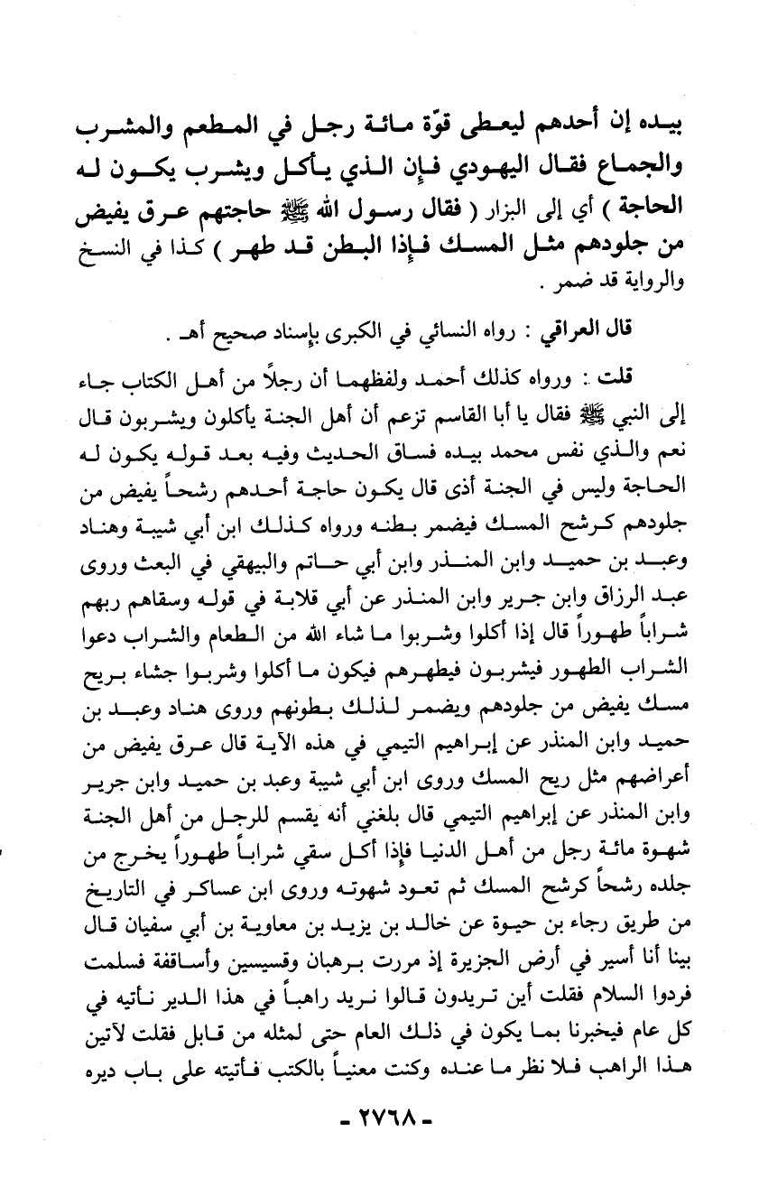 قلت: ورواه كذلك أحمد ولفظهما أن رجلاً من أهل الكتاب جاء إلى النبي - صلّى الله عليه وسلم - فقال يا أبا القاسم تزعم أن أهل الجنة يأكلون ويشربون قال نعم والذي نفس محمد بيده فساق الحديث وفيه بعد قوله يكون له الحاجة وليس في الجنة أذى قال يكون حاجة أحدهم رشحاً يفيض من جلودهم كرشح المسك فيضمر بطنه ورواه كذلك ابن أبي شيبة وهناد وعبد بن حميد وابن المنذر وابن أبي حاتم والبيهقي في البعث وروى عبد الرزاق وابن جرير وابن المنذر عن أبي قلابة في قوله وسقاهم ربهم شراباً طهوراً قال إذا أكلوا وشربواً ما شاء الله من الطعام والشراب دعوا الشراب الطهور فيشربون فيطهرهم فيكون ما أكلوا وشربوا جشاء بريح مسك يفيض من جلودهم ويضمر لذلك بطونهم وروى هناد وعبد بن حميد وابن المنذر عن إبراهيم التيمي في هذه الآية قال عرق يفيض من أعراضهم مثل ريح المسك وروى ابن أبي شيبة وعبد بن حميد وابن جرير وابن المنذر عن إبراهيم التيمي قال بلغني أنه يقسم للرجل من أهل الجنة شهوة مائة رجل من أهل الدنيا فإذا أكل سقي شراباً طهوراً يخرج من جلده رشحاً كرشح المسك ثم تعود شهوته وروى ابن عساكر في التاريخ من طريق رجاء بن حيوة عن خالد بن يزيد بن معاوية بن أبي سفيان قال بينا أنا أسير في أرض الجزيرة إذ مررت برهبان وقسيسين وأساقفة فسلمت فردوا السلام فقلت أين تريدون قالوا نريد راهباً في هذا الدير نأتيه في كل عام فيخبرنا بما يكون في ذلك العام حتى لمثله من قابل فقلت لآتين هذا الراهب فلا نظر ما عنده وكنت معنياً بالكتب فأتيته على باب ديره