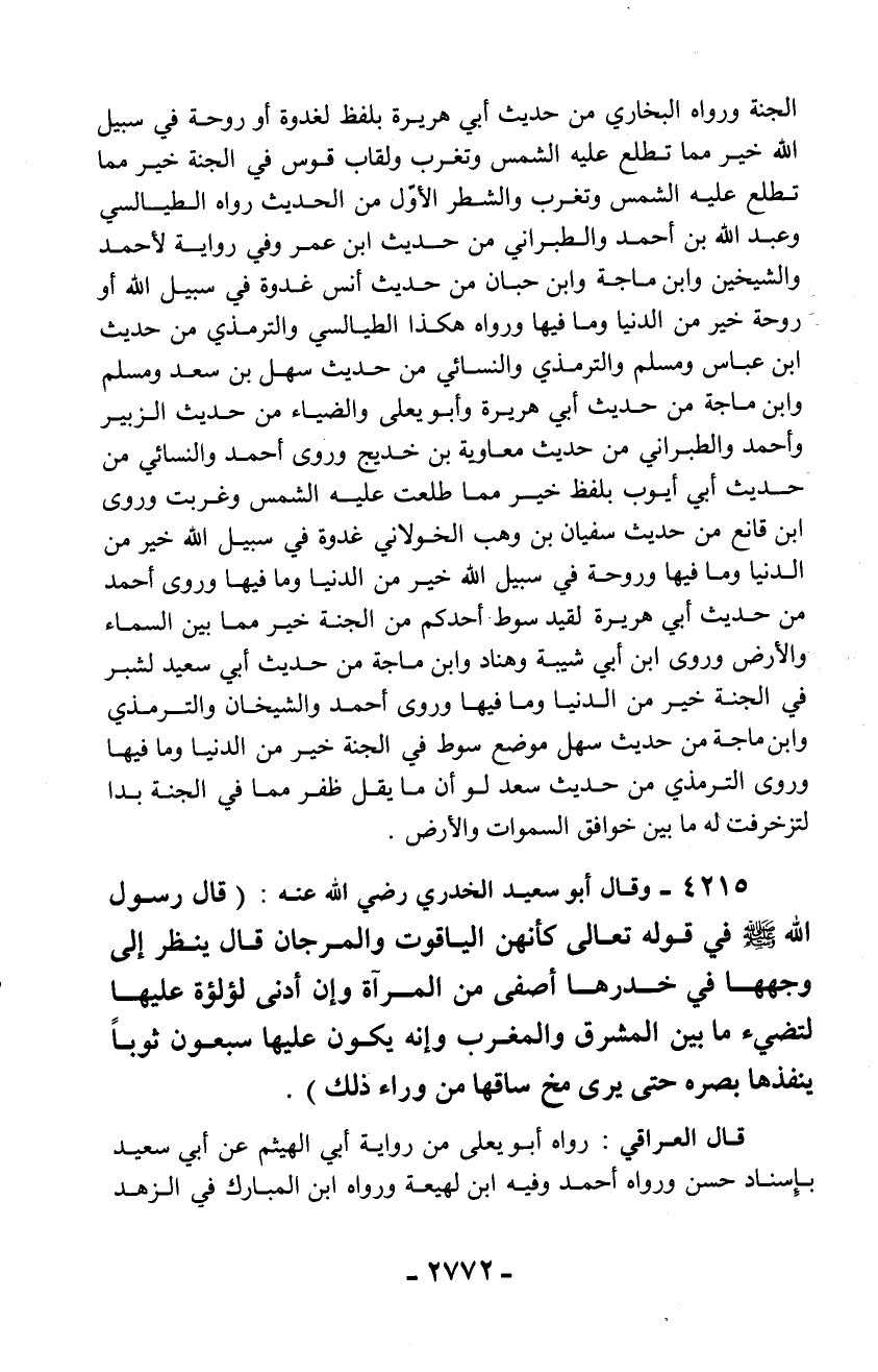 الجنة ورواه البخاري من حديث أبي هريرة بلفظ لغدوة أو روحة في سبيل الله خير مما تطلع عليه الشمس وتغرب ولقاب قوس في الجنة خير مما تطلع عليه الشمس وتغرب والشطر الأوّل من الحديث رواه الطيالسي وعبد الله بن أحمد والطبراني من حديث ابن عمر وفي رواية لأحمد والشيخين وابن ماجة وابن حبان من حديث أنس غدوة في سبيل الله أو روحة خير من الدنيا وما فيها ورواه هكذا الطيالسي والترمذي من حديث ابن عباس ومسلم والترمذي والنسائي من حديث سهل بن سعد ومسلم وابن ماجة من حديث أبي هريرة وأبو يعلى والضياء من حديث الزبير وأحمد والطبراني من حديث معاوية بن خديج وروى أحمد والنسائي من حديث أبي أيوب بلفظ خير مما طلعت عليه الشمس وغربت وروى ابن قانع من حديث سفيان بن وهب الخولاني غدوة في سبيل الله خير من الدنيا وما فيها وروحة في سبيل الله خير من الدنيا وما فيها وروى أحمد من حديث أبي هريرة لقيد سوط أحدكم من الجنة خير مما بين السماء والأرض وروى ابن أبي شيبة وهناد وابن ماجة من حديث أبي سعيد لشبر في الجنة خير من الدنيا وما فيها وروى أحمد والشيخان والترمذي وابن ماجة من حديث سهل موضع سوط في الجنة خير من الدنيا وما فيها وروى الترمذي من حديث سعد لو أن ما يقل ظفر مما في الجنة بدا لتزخرفت له ما بين خوافق السماوات والأرض.