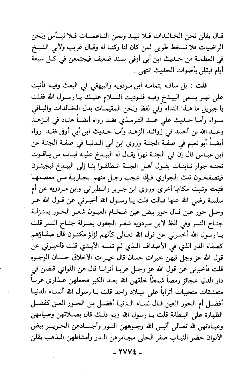 قلت: بل ساقه بتمامه ابن مردويه والبيهقي في البعث وفيه فأتيت على نهر يسمى البيدخ وفيه فنوديت السلام عليك يا رسول الله فقلت يا جبريل ما هذا النداء وفي لفظ ونحن المقيمات بدل الخالدات والباقي سواء وأما حديث علي عند الترمذي فقد رواه أيضاً هناد في الزهد وعبد الله بن أحمد في زوائد الزهد وأما حديث ابن أبي أوفى فقد رواه أيضاً أبو نعيم في صفة الجنة وروى ابن أبي الدنيا في صفة الجنة عن ابن عباس قال إن في الجنة نهراً يقال له البيدخ عليه قباب من ياقوت تحته جوار نابتات يقول أهل الجنة انطلقوا بنا إلى البيدخ فيجيئون فيتصفحون تلك الجواري فإذا عجب رجل منهم بجارية مس معصمها فتبعته وتنبت مكانها أخرى وروى ابن جرير والطبراني وابن مردويه عن أم سلمة رضي الله عنها قالت قلت يا رسول الله أخبرني عن قول الله عز وجل حور عين قال حور بيض عين ضخام العيون شعر الحور بمنزلة جناح النسر وفي لفظ لابن مردويه شفر الجفون بمنزلة جناح النسر قلت يا رسول الله أخبرني عن قول الله تعالى كأنهم لؤلؤ مكنون قال صفاؤهم كصفاء الدر الذي في الأصداف الذي لم تمسه الأيدي قلت فأخبرني عن قول الله عز وجل فيهن خيرات حسان قال خيرات الأخلاق حسان الوجوه قلت فأخبرني عن قول الله عز وجل عربا أترابا قال هن اللواتي قبضن في دار الدنيا عجائز رمصاً شمطاً خلقهن الله بعد الكبر فجعلهن عذارى عرباً متعشقات متحببات أتراباً على ميلاد واحد قلت يا رسول الله أنساء الدنيا أفضل أم الحور العين قال نساء الدنيا أفضل من الحور العين كفضل الظهارة على البطانة قلت يا رسول الله وبم ذلك قال بصلاتهن وصيامهن وعبادتهن لله تعالى ألبس الله وجوههن النور وأجسادهن الحرير بيض الألوان خضر الثياب صفر الحلى مجامرهن الدر وأمشاطهن الذهب يقلن