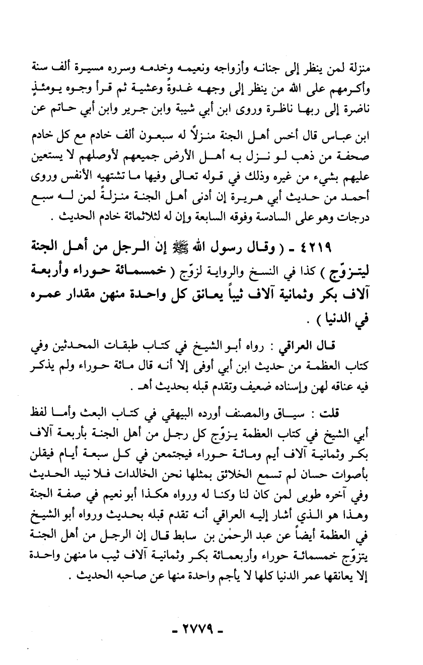قال العراقي: رواه أبو الشيخ في كتاب طبقات المحدثين وفي كتاب العظمة من حديث ابن أبي أوفى إلا أنه قال مائة حوراء ولم يذكر فيه عناقه لهن وإسناده ضعيف وتقدم قبله بحديث أهـ.