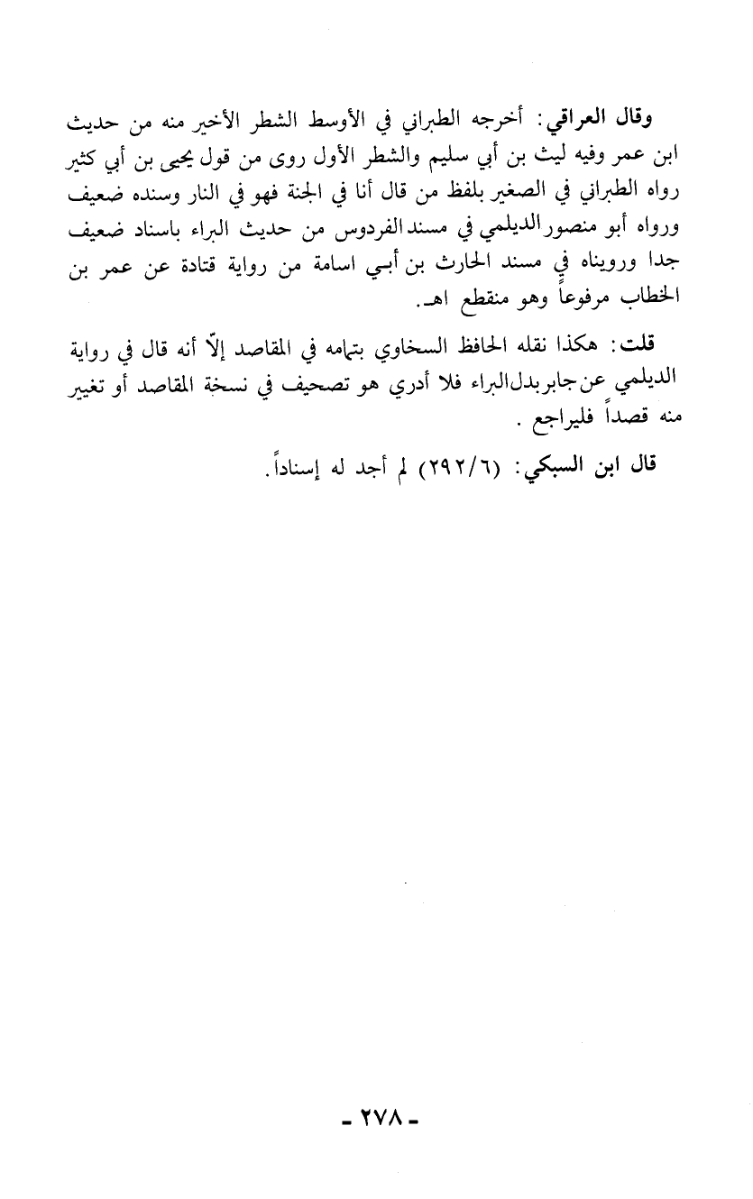 قلت: هكذا نقله الحافظ السخاوي بتمامه في المقاصد إلاَّ أنه قال في رواية الديلمي عن جابر بدل البراء فلا أدري هو تصحيف في نسخة المقاصد أو تغيير منه قصداً فليراجع.