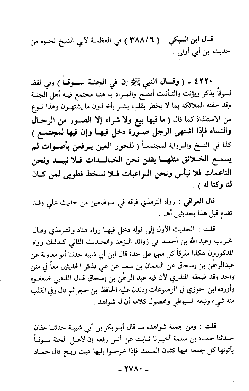 4220 - (وقال النبي - صلّى الله عليه وسلم - إن في الجنة سوقاً) وفي لفظ لسوقاً يذكر ويؤنث والتأنيث أفصح والمراد به هنا مجتمع فيه أهل الجنة وقد حفته الملائكة بما لا يخطر بقلب بشر يأخذون ما يشتهون وهذا نوع من الاستلذاذ كما قال (ما فيها بغ ولا شراء إلا الصور من الرجال والنساء فإذا اشتهى الرجل صورة دخل فيها وإن فيها لمجتمع) كذا في النسخ والرواية لمجتمعاً (للحور العين يرفعن بأصوات لم يسمع الخلائق مثلها يقلن نحن الخالدات فلا نبيد ونحن الناعمات فلا نبأس ونحن الراغبات فلا نسخط فطوبى لمن كان لنا وكنا له).