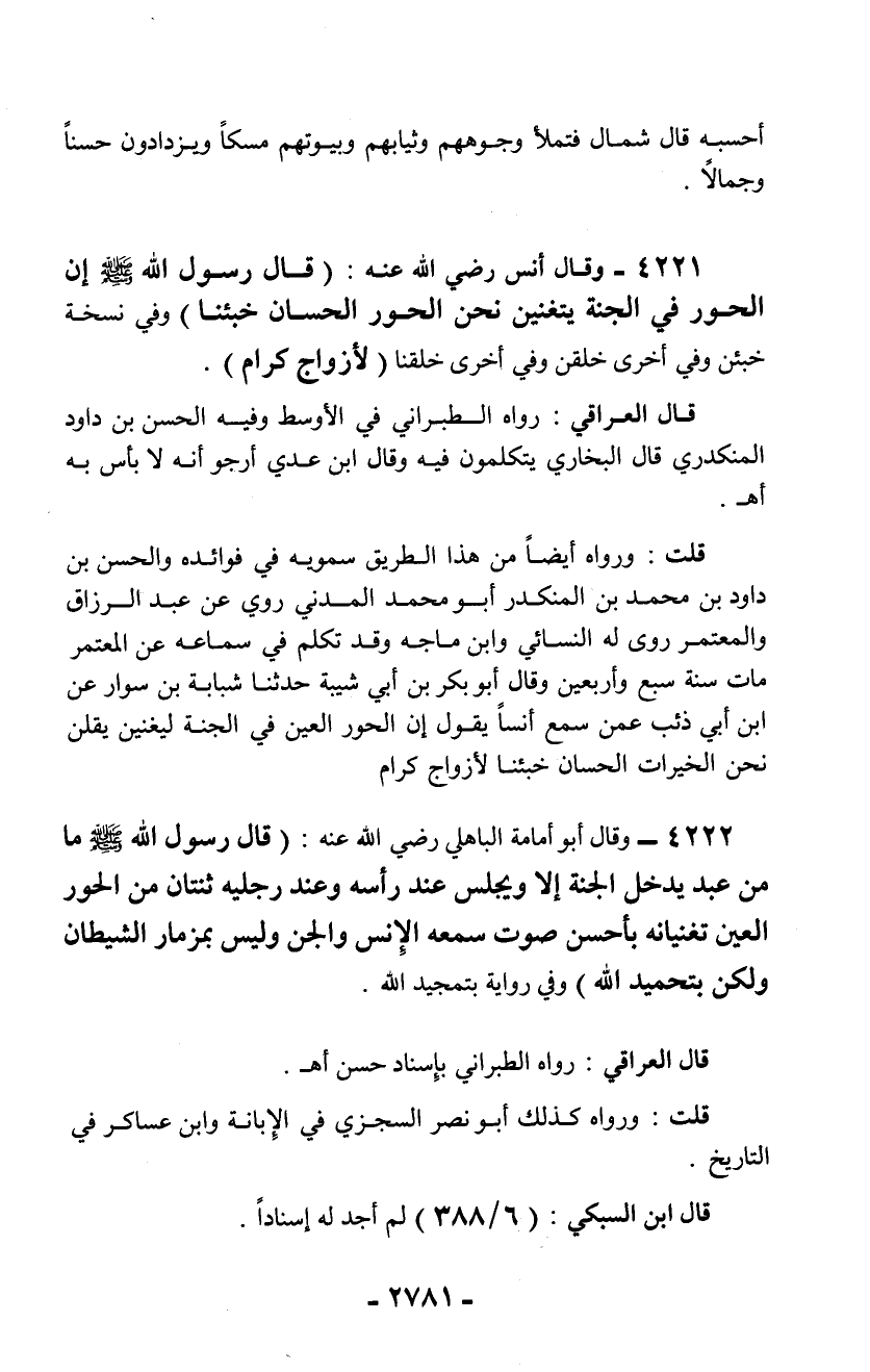 4222 - وقال أبو أمامة الباهلي رضي الله عنه: (قال رسول الله - صلّى الله عليه وسلم - ما من عبد يدخل الجنة إلا ويجلس عند رأسه وعند رجليه ثنتان من الحور العين تغنيانه بأحسن صوت سمعه الإنس والجن وليس بمزمار الشيطان ولكن بتحميد الله) وفي رواية بتمجيد الله.