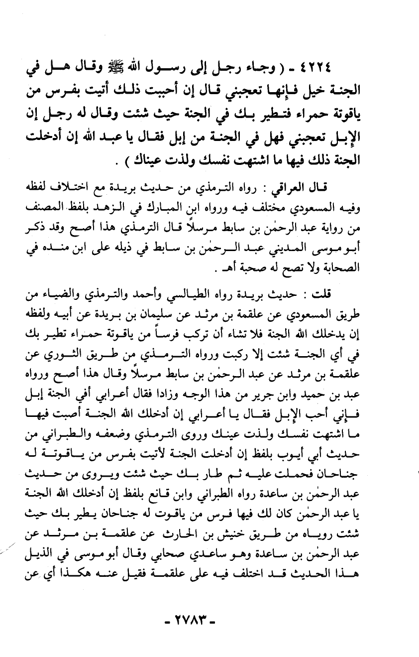 4224 - (وجاء رجل إلى رسول الله - صلّى الله عليه وسلم - وقال هل في الجنة خيل فإنها تعجبني قال إن أحببت ذلك أتيت بفرس من ياقوتة حمراء فتطير بك في الجنة حيث شئت وقال له رجل إن الإبل تعجبني فهل في الجنة من إبل فقال يا عبد الله إن أدخلت الجنة ذلك فيها ما اشتهت نفسك ولذت عيناك).