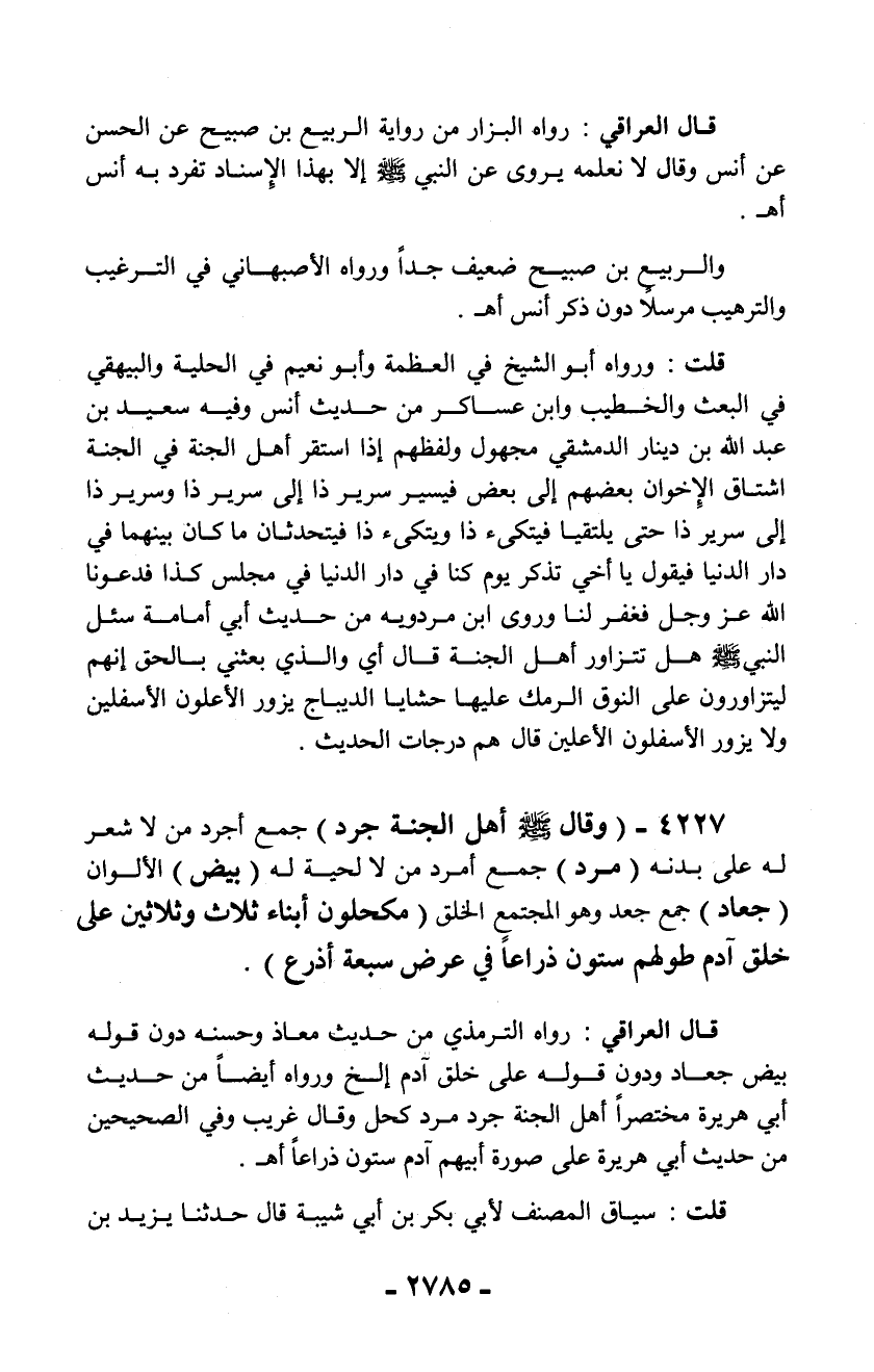 4227 - (وقال - صلّى الله عليه وسلم - أهل الجنة جرد) جمع أجرد من لا شعر له على بدنه (مرد) جمع أمرد من لا لحية له (بيض) الألوان (جعاد) جمع جعد وهو المجتمع الخلق (مكحلون أبناء ثلاث وثلاثين على خلق آدم طولهم ستون ذراعاً في عرض سبعة أذرع).
