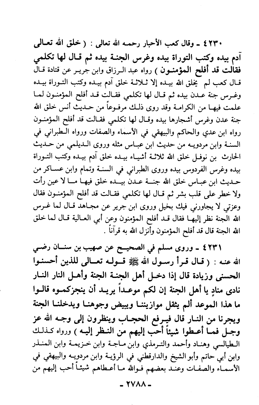 4230 - وقال كعب الأحبار رحمه الله تعالى: (خلق الله تعالى آدم بيده وكتب التوراة بيده وغرس الجنة بيده ثم قال لها تكلمي فقالت قد أفلح المؤمنون) رواه عبد الرزاق وابن جرير عن قتادة قال قال كعب لم يخلق الله بيده إلا ثلاثة خلق آدم بيده وكتب التوراة بيده وغرس جنة عدن بيده ثم قال لها تكلمي فقالت قد أفلح المؤمنون لما علمت فيها من الكرامة وقد روى ذلك مرفوعاً من حديث أنس خلق الله جنة عدن وغرس أشجارها بيده وقال لها تكلمي فقالت قد أفلح المؤمنون رواه ابن عدي والحاكم والبيهقي في الأسماء والصفات ورواه الطبراني في السنة وابن مردويه من حديث ابن عباس مثله وروى الديلمي من حديث الحارث بن نوفل خلق الله ثلاثة أشياء بيده خلق آدم بيده وكتب التوراة بيده وغرس الفردوس بيده وروى الطبراني في السنة وتمام وابن عساكر من حديث ابن عباس خلق الله جنة عدن بيده خلق فيها ما لا عين رأت ولا خطر على قلب بشر ثم قال لها تكلمي فقالت قد أفلح المؤمنون فقال وعزتي لا يجاورني فيك بخيل وروى ابن جرير عن مجاهد قال لما غرس الله الجنة نظر إليها فقال قد أفلح المؤمنون وعن أبي العالية قال لما خلق الله الجنة قال قد أفلح المؤمنون وأنزل الله به قرآناً.