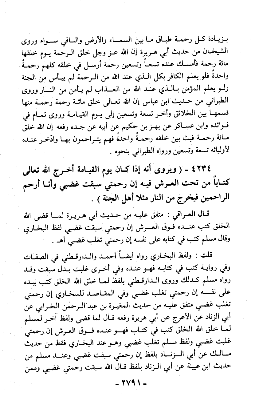 4234 - (ويروى أنه إذا كان يوم القيامة أخرج الله تعالى كتاباً من تحت العرش فيه إن رحمتي سبقت غضبي وأنا أرحم الراحمين فيخرج من النار مثلا أهل الجنة).