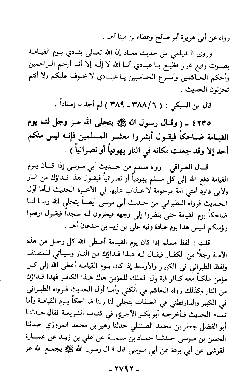 4235 - (وقال رسول الله - صلّى الله عليه وسلم - يتجلى الله عز وجل لنا يوم القيامة ضاحكاً فيقول أبشروا معشر المسلمين فإنه ليس منكم أحد إلا وقد جعلت مكانه في النار يهودياً أو نصرانياً).