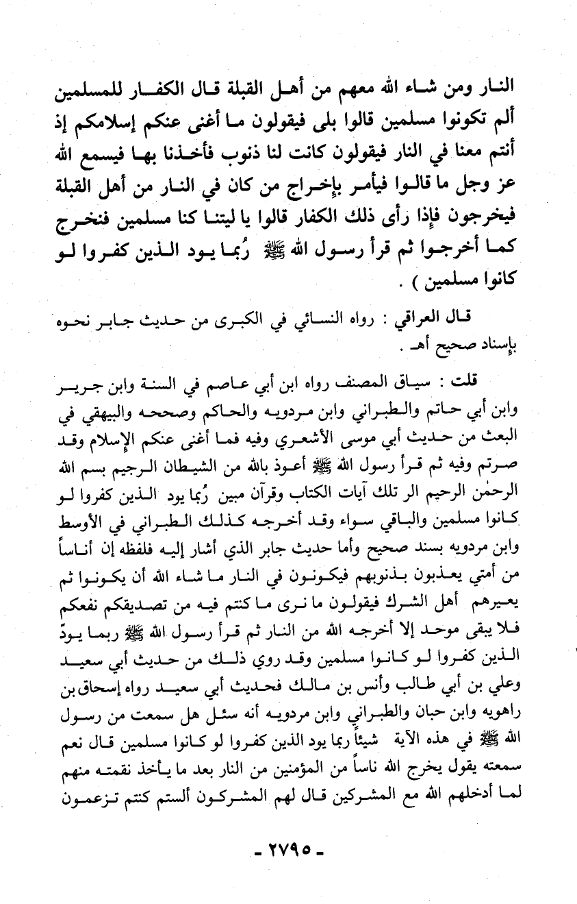 النار ومن شاء الله معهم من أهل القبلة قال الكفار للمسلمين ألم تكونوا مسلمين قالوا بلى فيقولون ما أغنى عنكم إسلامكم إذ أنتم معنا في النار فيقولون كانت لنا ذنوب فأخذنا بها فيسمع الله عز وجل ما قالوا فيأمر بإخراج من كان في النار من أهل القبلة فيخرجون فإذا رأى ذلك الكفار قالوا يا ليتنا كنا مسلمين فنخرج كما أخرجوا ثم قرأ رسول الله - صلّى الله عليه وسلم - رُبما يود الذين كفروا لو كانوا مسلمين).
