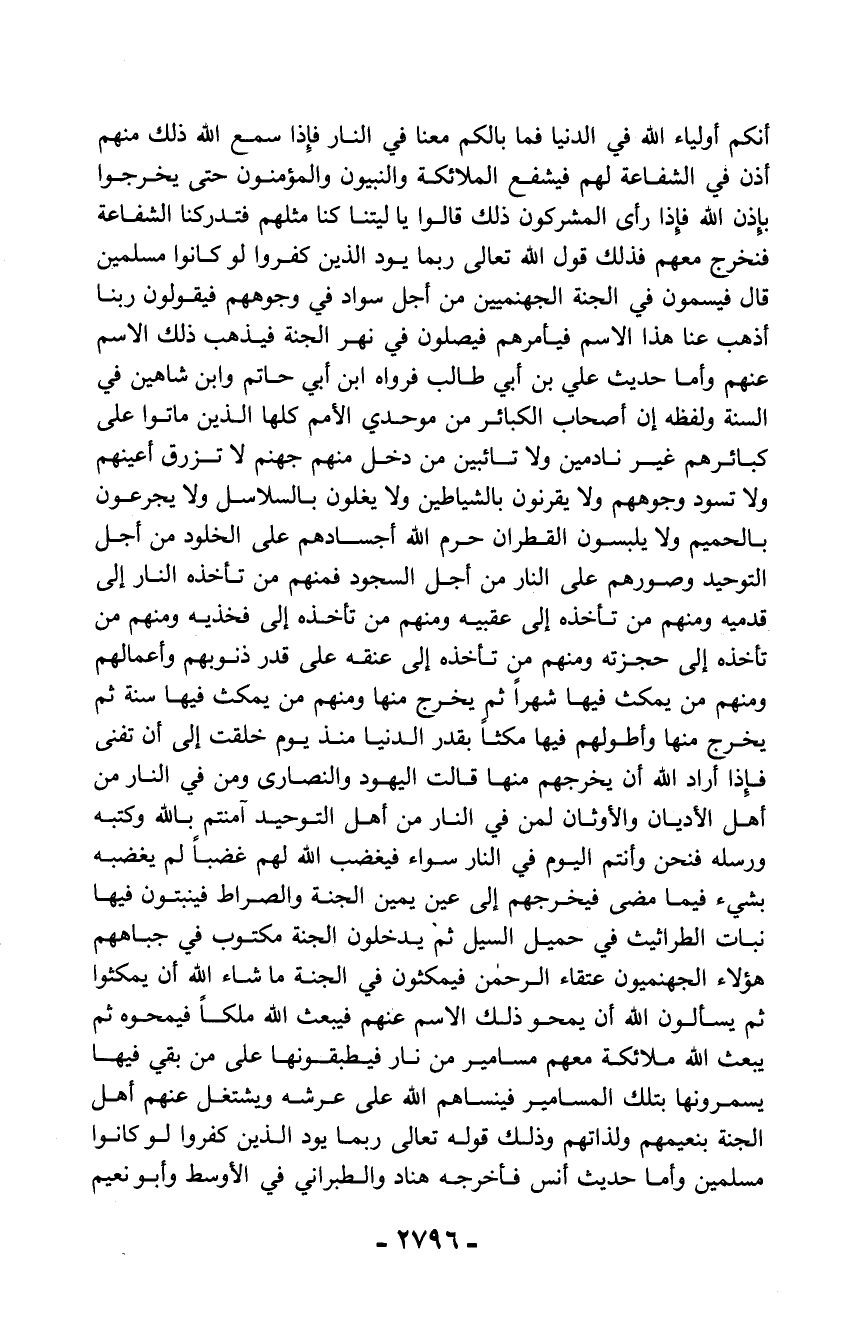 أنكم أولياء الله في الدنيا فما بالكم معنا في النار فإذا سمع الله ذلك منهم أذن في الشفاعة لهم فيشفع الملائكة والنبيون والمؤمنون حتى يخرجوا بإذن الله فإذا رأى المشركون ذلك قالوا يا ليتنا كنا مثلهم فتدركنا الشفاعة فنخرج معهم فذلك قول الله تعالى ربما يود الذين كفروا لو كانوا مسلمين قال فيسمون في الجنة الجهنميين من أجل سواد في وجوههم فيقولون ربنا أذهب عنا هذا الاسم فيأمرهم فيصلون في نهر الجنة فيذهب ذلك الاسم عنهم وأما حديث علي بن أبي طالب فرواه ابن أبي حاتم وابن شاهين في السنة ولفظه إن أصحاب الكبائر من موحدي الأمم كلها الذين ماتوا على كبائرهم غير نادمين ولا تائبين من دخل منهم جهنم لا تزرق أعينهم ولا تسود وجوههم ولا يقرنون بالشياطين ولا يغلون بالسلاسل ولا يجرعون بالحميم ولا يلبسون القطران حرم الله أجسادهم على الخلود من أجل التوحيد وصورهم على النار من أجل السجود فمنهم من تأخذه النار إلى قدميه ومنهم من تأخذه إلى عقبيه ومنهم من تأخذه إلى فخذيه ومنهم من تأخذه إلى حجزته ومنهم من تأخذه إلى عنقه على قدر ذنوبهم وأعمالهم ومنهم من يمكث فيها شهراً ثم يخرج منها ومنهم من يمكث فيها سنة ثم يخرج منها وأطولهم فيها مكثاً بقدر الدنيا منذ يوم خلقت إلى أن تفنى فإذا أراد الله أن يخرجهم منها قالت اليهود والنصارى ومن في النار من أهل الأديان والأوثان لمن في النار من أهل التوحيد آمنتم بالله وكتبه ورسله فنحن وأنتم اليوم في النار سواء فيغضب الله لهم غضباً لم يغضبه بشيء فيما مضى فيخرجهم إلى عين يمين الجنة والصراط فينبتون فيها نبات الطراثيث في حميل السيل ثم يدخلون الجنة مكتوب في جباههم هؤلاء الجهنميون عتقاء الرحمن فيمكثون في الجنة ما شاء الله أن يمكثوا ثم يسألون الله أن يمحو ذلك الاسم عنهم فيبعث الله ملكاً فيمحوه ثم يبعث الله ملائكة معهم مسامير من نار فيطبقونها على من بقي فيها يسمرونها بتلك المسامير فينساهم الله على عرشه ويشتغل عنهم أهل الجنة بنعيمهم ولذاتهم وذلك قوله تعالى ربما يود الذين كفروا لو كانوا مسلمين وأما حديث أنس فأخرجه هناد والطبراني في الأوسط وأبو نعيم