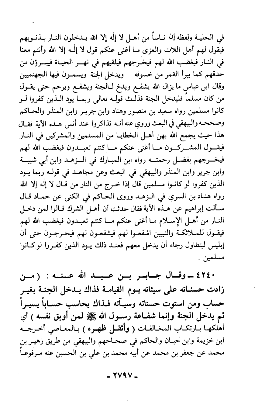 4240 - وقال جابر بن عبد الله عنه: (من زادت حسناته على سيئاته يوم القيامة فذاك يدخل الجنة بغير حساب ومن استوت حسناته وسيآته فذاك يحاسب حساباً يسيراً ثم يدخل الجنة وإنما شفاعة رسول الله - صلّى الله عليه وسلم - لمن أوبق نفسه) أي أهلكها بارتكاب المخالفات (وأثقل ظهره) بالمعاصي أخرجه ابن خزيمة وابن حبان والحاكم في صحاحهم والبيهقي من طريق زهير بن محمد عن جعفر بن محمد عن أبيه محمد بن علي بن الحسين عنه مرفوعاً