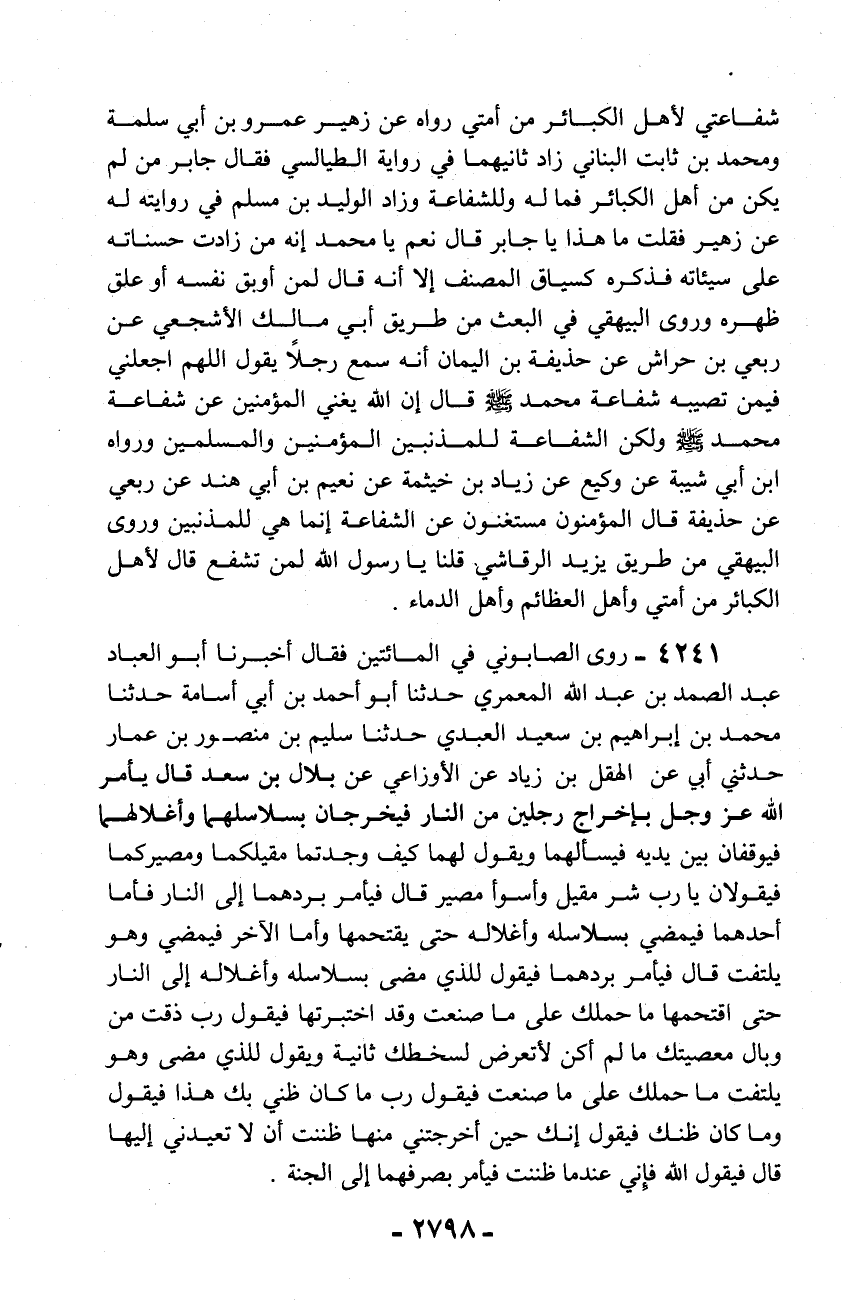 4241 - روى الصابوني في المائتين فقال أخبرنا أبو العباد عبد الصمد بن عبد الله المعمري حدثنا أبو أحمد بن أبي أسامة حدثنا محمد بن إبراهيم بن سعيد العبدي حدثنا سليم بن منصور بن عمار حدثني أبي عن الهقل بن زياد عن الأوزاعي عن بلال بن سعد قال يأمر الله عز وجل بإخراج رجلين من النار فيخرجان بسلاسلهما وأغلالهما فيوقفان بين يديه فيسألهما ويقول لهما كيف وجدتما مقيلكما ومصيركما فيقولان يا رب شر مقيل وأسوأ مصير قال فيأمر بردهما إلى النار فأما أحدهما فيمضي بسلاسله وأغلاله حتى يقتحمها وأما الآخر فيمضي وهو يلتفت قال فيأمر بردهما فيقول للذي مضى بسلاسله وأغلاله إلى النار حتى اقتحمها ما حملك على ما صنعت وقد اختبرتها فيقول رب ذقت من وبال معصيتك ما لم أكن لأتعرض لسخطك ثانية ويقول للذي مضى وهو يلتفت ما حملك على ما صنعت فيقول رب ما كان ظني بك هذا فيقول وما كان ظنك فيقول إنك حين أخرجتني منها ظننت أن لا تعيدني إليها قال فيقول الله فإني عندما ظننت فيأمر بصرفهما إلى الجنة.
