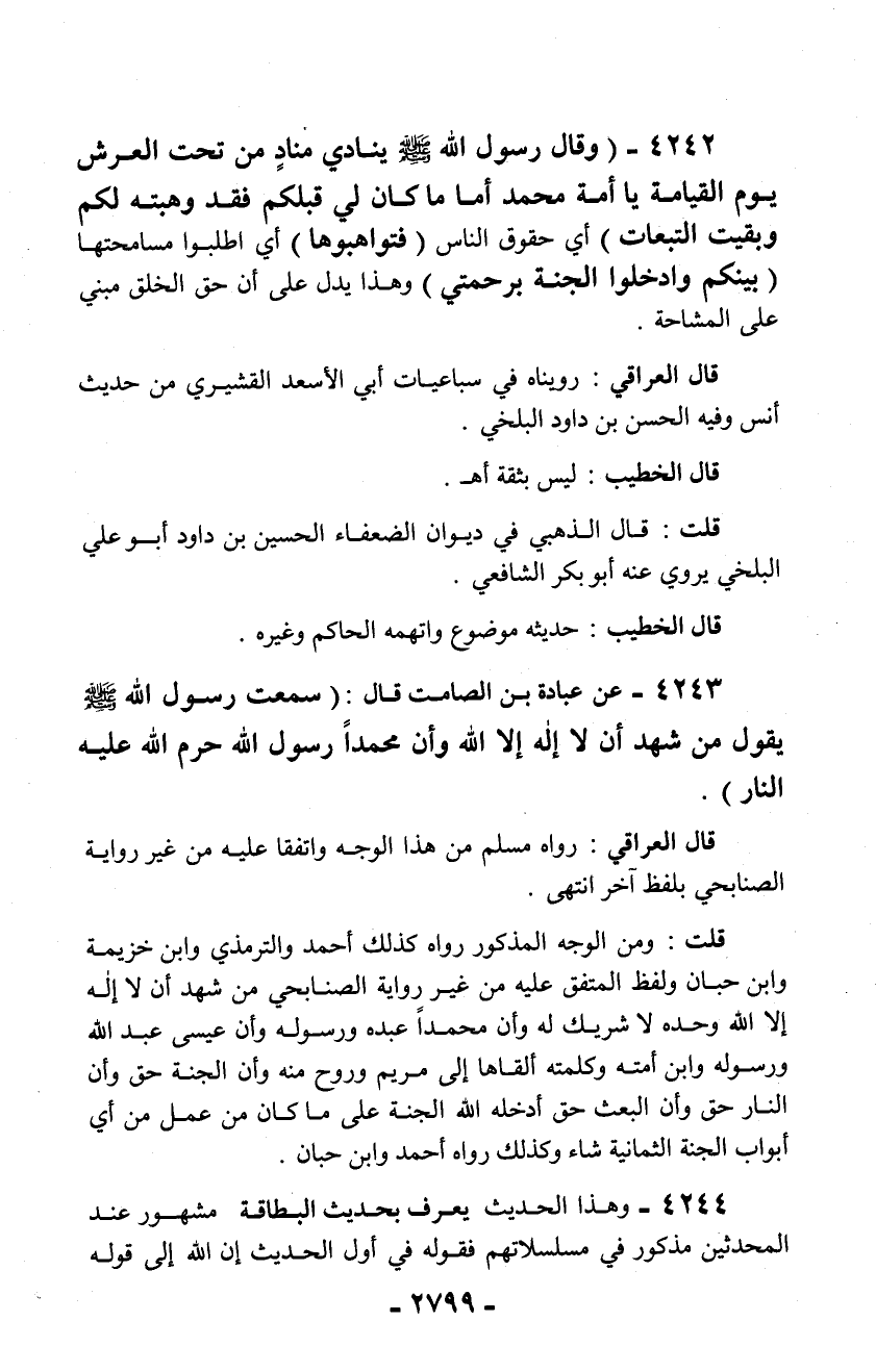 4242 - (وقال رسول الله - صلّى الله عليه وسلم - ينادي مناد من تحت العرش يوم القيامة يا أمة محمد أما ما كان لي قبلكم فقد وهبته لكم وبقيت التبعات) أي حقوق الناس (فتواهبوها) أي اطلبوا مسامحتها (بينكم وادخلوا الجنة برحمتي) وهذا يدل على أن حق الخلق مبني على المشاحة.