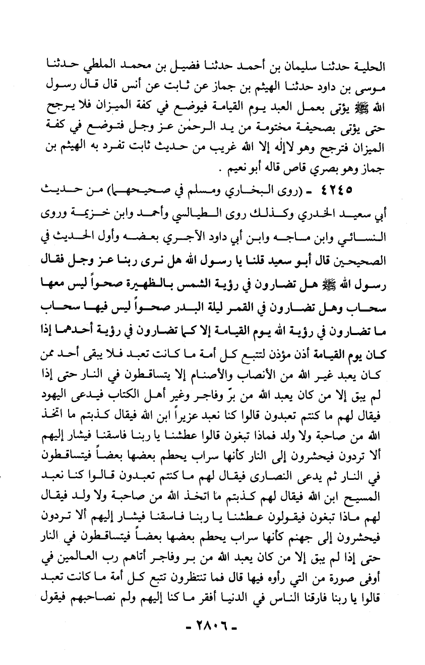4245 - (روى البخاري ومسلم في صحيحهما) من حديث أبي سعيد الخدري وكذلك روى الطيالسي وأحمد وابن خزيمة وروى النسائي وابن ماجه وابن أبي داود الأجري بعضه وأول الحديث في الصحيحين قال أبو سعيد قلنا يا رسول الله هل نرى ربنا عز وجل فقال رسول الله - صلّى الله عليه وسلم - هل تضارون في رؤية الشمس بالظهيرة صحواً ليس معها سحاب وهل تضارون في القمر ليلة البدر صحواً ليس فيها سحاب ما تضارون في رؤية الله يوم القيامة إلا كما تضارون في رؤية أحدهما إذا كان يوم القيامة أذن مؤذن لتتبع كل أمة ما كانت تعبد فلا يبقى أحد ممن كان يعبد غير الله من الأنصاب والأصنام إلا يتساقطون في النار حتى إذا لم يبق إلا من كان يعبد الله من بر وفاجر وغير أهل الكتاب فيدعى اليهود فيقال لهم ما كنتم تعبدون قالوا كنا نعبد عزيراً ابن الله فيقال كذبتم ما اتخذ الله من صاحبة ولا ولد فماذا تبغون قالوا عطشنا يا ربنا فاسقنا فيشار إليهم ألا تردون فيحشرون إلى النار كأنها سراب يحطم بعضها بعضاً فيتساقطون في النار ثم يدعى النصارى فيقال لهم ما كنتم تعبدون قالوا كنا نعبد المسيح ابن الله فيقال لهم كذبتم ما اتخذ الله من صاحبة ولا ولد فيقال لهم ماذا تبغون فيقولون عطشنا يا ربنا فاسقنا فيشار إليهم ألا تردون فيحشرون إلى جهنم كأنها سراب يحطم بعضها بعضاً فيتساقطون في النار حتى إذا لم يبق إلا من كان يعبد الله من بر وفاجر أتاهم رب العالمين في أو فى صورة من التي رأوه فيها قال فما تنتظرون تتبع كل أمة ما كانت تعبد قالوا يا ربنا فارقنا الناس في الدنيا أفقر ما كنا إليهم ولم نصاحبهم فيقول