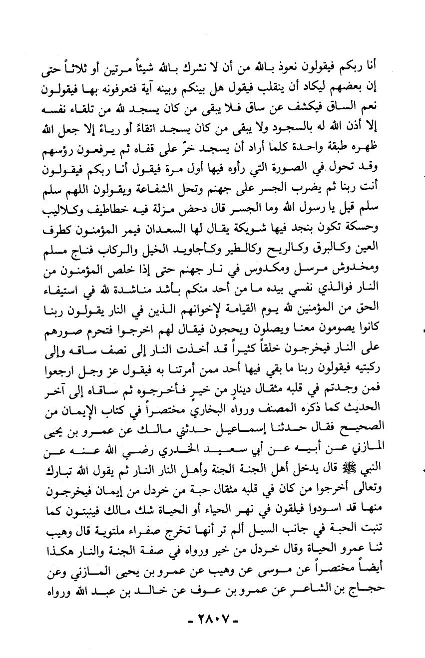 أنا ربكم فيقولون نعوذ بالله من أن لا نشرك بالله شيئاً مرتين أو ثلاثاً حتى إن بعضهم ليكاد أن ينقلب فيقول هل بينكم وبينه آية فتعرفونه بها فيقولون نعم الساق فيكشف عن ساق فلا يبقى من كان يسجد لله من تلقاء نفسه إلا أذن الله له بالسجود ولا يبقى من كان يسجد اتقاءً أو رياءً إلا جعل الله ظهره طبقة واحدة كلما أراد أن يسجد خرّ على قفاه ثم يرفعون رؤسهم وقد تحول في الصورة التي رأوه فيها أول مرة فيقول أنا ربكم فيقولون أنت ربنا ثم يضرب الجسر على جهنم وتحل الشفاعة ويقولون اللهم سلم سلم قيل يا رسول الله وما الجسر قال دحض مزلة فيه خطاطيف وكلاليب وحسكة تكون بنجد فيها شويكة يقال لها السعدان فيمر المؤمنون كطرف العين وكالبرق وكالريح وكالطير وكأجاويد الخيل والركاب فناج مسلم ومخدوش مرسل ومكدوس في نار جهنم حتى إذا خلص المؤمنون من النار فوالذي نفسي بيده ما من أحد منكم بأشد مناشدة لله في استيفاء الحق من المؤمنين لله يوم القيامة لإخوانهم الذين في النار يقولون ربنا كانوا يصومون معنا ويصلون ويحجون فيقال لهم اخرجوا فتحرم صورهم على النار فيخرجون خلقاً كثيراً قد أخذت النار إلى نصف ساقه وإلى ركبتيه فيقولون ربنا ما بقي فيها أحد ممن أمرتنا به فيقول عز وجل ارجعوا فمن وجدتم في قلبه مثقال دينار من خيبر فأخرجوه ثم ساقاه إلى آخر الحديث كما ذكره المصنف ورواه البخاري مختصراً في كتاب الإيمان من الصحيح فقال حدثنا إسماعيل حدثني مالك عن عمرو بن يحيى المازني عن أبيه عن أبي سعيد الخدري رضي الله عنه عن النبي - صلّى الله عليه وسلم - قال يدخل أهل الجنة الجنة وأهل النار النار ثم يقول الله تبارك وتعالى أخرجوا من كان في قلبه مثقال حبة من خردل من إيمان فيخرجون منها قد اسودوا فيلقون في نهر الحياء أو الحياة شك مالك فينبتون كما تنبت الحبة في جانب السيل ألم تر أنها تخرج صفراء ملتوية قال وهيب ثنا عمرو الحياة وقال خردل من خير ورواه في صفة الجنة والنار هكذا أيضاً مختصراً عن موسى عن وهيب عن عمرو بن يحيى المازني وعن حجاج بن الشاعر عن عمرو بن عوف عن خالد بن عبد الله ورواه