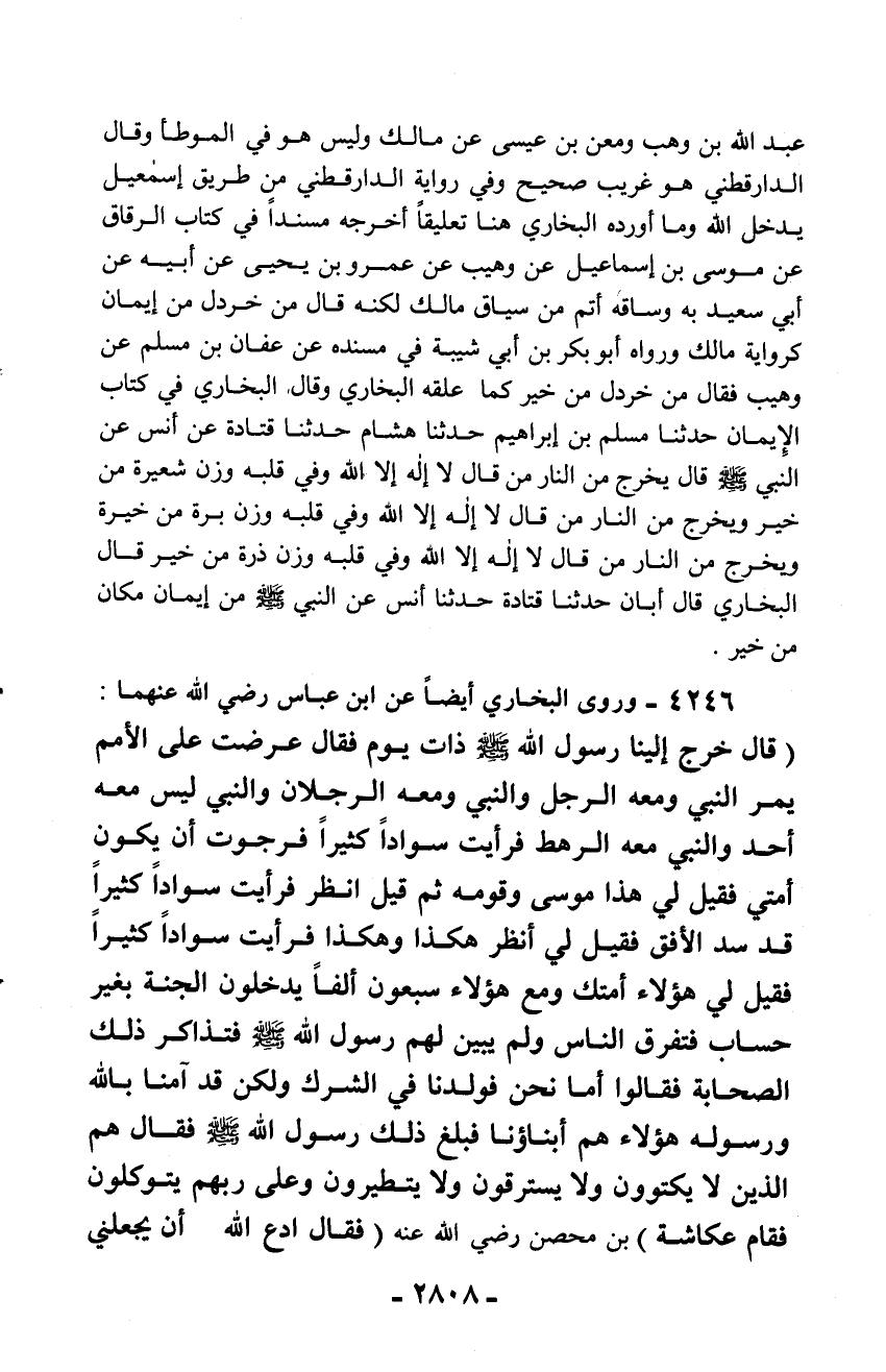 4246 - وروى البخاري أيضاً عن ابن عباس رضي الله عنهما: (قال خرج إلينا رسول الله - صلّى الله عليه وسلم - ذات يوم فقال عرضت على الأمم يمر النبي ومعه الرجل والنبي ومعه الرجلان والنبي ليس معه أحد والنبي معه الرهط فرأيت سواداً كثيراً فرجوت أن يكون أمتي فقيل لي هذا موسى وقومه ثم قيل انظر فرأيت سواداً كثيراً قد سد الأفق فقيل لي أنظر هكذا وهكذا فرأيت سواداً كثيراً فقيل لي هؤلاء أمتك ومع هؤلاء سبعون ألفاً يدخلون الجنة بغير حساب فتفرق الناس ولم يبين لهم رسول الله - صلّى الله عليه وسلم - فتذاكر ذلك الصحابة فقالوا أما نحن فولدنا في الشرك ولكن قد آمنا بالله ورسوله هؤلاء هم أبناؤنا فبلغ ذلك رسول الله - صلّى الله عليه وسلم - فقال هم الذين لا يكتوون ولا يسترقون ولا يتطيرون وعلى ربهم يتوكلون فقام عكاشة) بن محصن رضي الله عنه (فقال ادع الله أن يجعلني