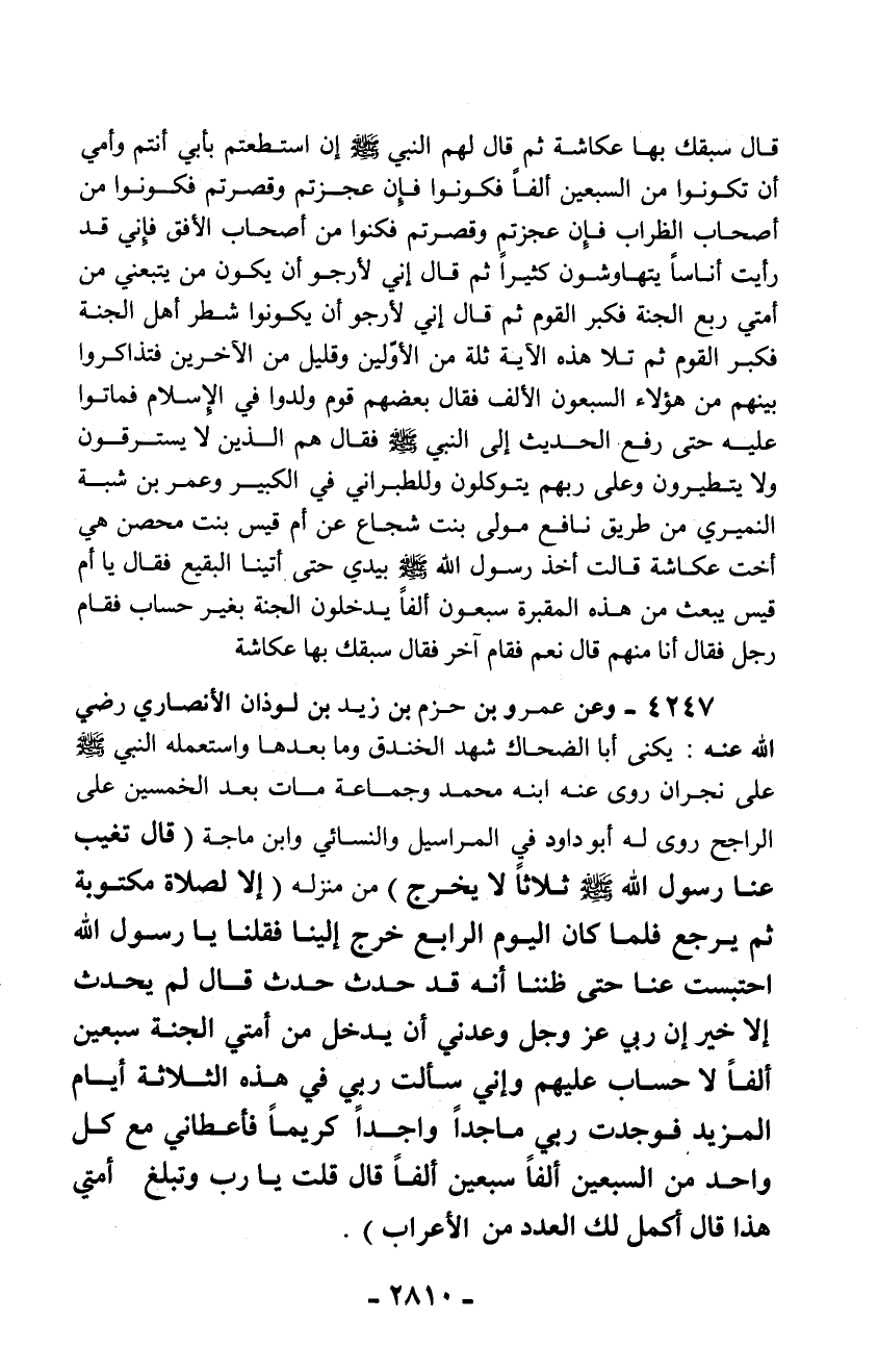 4247 - وعن عمرو بن حزم بن زيد بن لوذان الأنصاري رضي الله عنه: يكنى أبا الضحاك شهد الخندق وما بعدها واستعمله النبي - صلّى الله عليه وسلم - على نجران روى عنه ابنه محمد وجماعة مات بعد الخمسين على الراجح روى له أبو داود في المراسيل والنسائي وابن ماجة (قال تغيب عنا رسول الله - صلّى الله عليه وسلم - ثلاثاً لا يخرج) من منزله (إلا لصلاة مكتوبة ثم يرجع فلما كان اليوم الرابع خرج إلينا فقلنا يا رسول الله احتبست عنا حتى ظننا أنه قد حدث حدث قال لم يحدث إلا خير إن رب عز وجل وعدني أن يدخل من أمتي الجنة سبعين ألفاً لا حساب عليهم وإني سألت ربي في هذه الثلاثة أيام المزيد فوجدت ربي ماجداً واجداً كريماً فأعطاني مع كل واحد من السبعين ألفاً سبعين ألفاً قال قلت يا رب وتبلغ أمتي هذا قال أكمل لك العدد من الأعراب).
