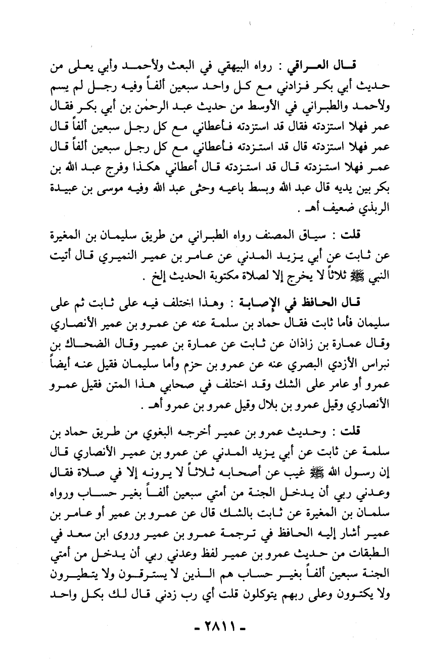 قلت: وحديث عمرو بن عمير أخرجه البغوي من طريق حماد بن سلمة عن ثابت عن أبي يزيد المدني عن عمرو بن عمير الأنصاري قال إن رسول الله - صلّى الله عليه وسلم - غيب عن أصحابه ثلاثاً لا يرونه إلا في صلاة فقال وعدني ربي أن يدخل الجنة من أمتي سبعين ألفاً بغير حساب ورواه سلمان بن المغيرة عن ثابت بالشك قال عن عمرو بن عمير أو عامر بن عمير أشار إليه الحافظ في ترجمة عمرو بن عمير وروى ابن سعد في الطبقات من حديث عمرو بن عمير لفظ وعدني ربي أن يدخل من أمتي الجنة سبعين ألفاً بغير حساب هم الذين لا يسترقون ولا يتطيرون ولا يكتوون وعلى ربهم يتوكلون قلت أي رب زدني قال لك بكل واحد