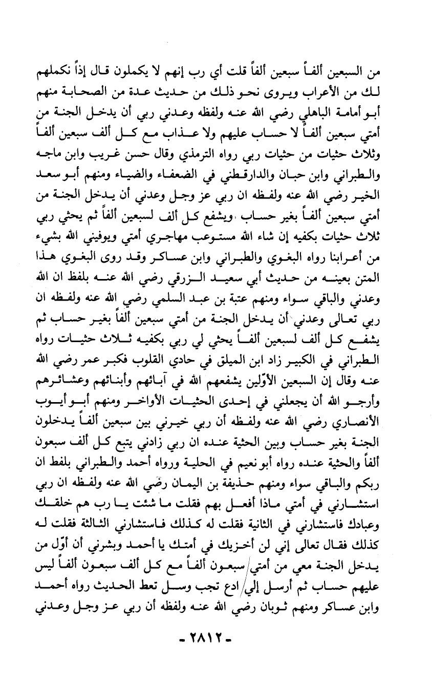 من السبعين ألفاً سبعين ألفاً قلت أي رب إنهم لا يكملون قال إذاً نكملهم لك من الأعراب ويروى نحو ذلك من حديث عدة من الصحابة منهم أبو أمامة الباهلي رضي الله عنه ولفظه وعدني ربي أن يدخل الجنة من أمتي سبعين ألفاً لا حساب عليهم ولا عذاب مع كل ألف سبعين ألفاً وثلاث حثيات من حثيات ربي رواه الترمذي وقال حسن غريب وابن ماجه والطبراني وابن حبان والدارقطني في الضعفاء والضياء ومنهم أبو سعد الخير رضي الله عنه ولفظه أن ربي عز وجل وعدني أن يدخل الجنة من أمتي سبعين ألفاً بغير حساب ويشفع كل ألف لسبعين ألفاً ثم يحثي ربي ثلاث حثيات بكفيه إن شاء الله مستوعب مهاجري أمتي ويوفيني الله بشيء من أعرابنا رواه البغوي والطبراني وابن عساكر وقد روى البغوي هذا المتن بعينه من حديث أبي سعيد الزرقي رضي الله عنه بلفظ أن الله وعدني والباقي سواء ومنهم عتبة بن عبد السلمي رضي الله عنه ولفظه أن ربي تعالى وعدني أن يدخل الجنة من أمتي سبعين ألفاً بغير حساب ثم يشفع كل ألف لسبعين ألفاً يحثي لي ربي بكفيه ثلاث حثيات رواه الطبراني في الكبير زاد ابن الميلق في حادي القلوب فكبر عمر رضي الله عنه وقال إن السبعين الأوّلين يشفعهم الله في آبائهم وأبنائهم وعشائرهم وأرجو الله أن يجعلني في إحدى الحثيات الأواخر ومنهم أبو أيوب الأنصاري رضي الله عنه ولفظه أن ربي خيرني بين سبعين ألفاً يدخلون الجنة بغير حساب وبين الحثية عنده أن ربي زادني يتبع كل ألف سبعون ألفاً والحثية عنده رواه أبو نعيم في الحلية ورواه أحمد والطبراني بلفط أن ربكم والباقي سواء ومنهم حذيفة بن اليمان رضي الله عنه ولفظه أن ربي استشارني في أمتي ماذا أفعل بهم فقلت ما شئت يا رب هم خلقك وعبادك فاستشارني في الثانية فقلت له كذلك فاستشارني الثالثة فقلت له كذلك فقال تعالى إني لن أخزيك في أمتك يا أحمد وبشرني أن أوّل من يدخل الجنة معي من أمتي فيسبعون ألفاً مع كل ألف سبعون ألفاً ليس عليهم حساب ثم أرسل إلي ادع تجب وسل تعط الحديث رواه أحمد وابن عساكر ومنهم ثوبان رضي الله عنه ولفظه أن ربي عز وجل وعدني