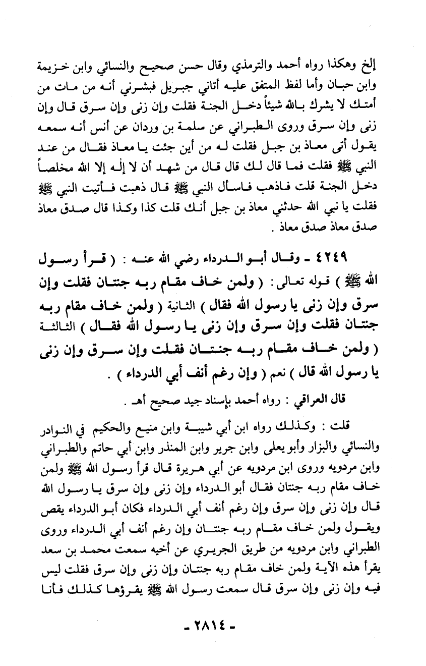 4249 - وقال أبو الدرداء رضي الله عنه: (قرأ رسول الله - صلّى الله عليه وسلم -) قوله تعالى: (ولمن خاف مقام ربه جنتان فقلت وإن سرق وإن زنى يا رسول الله فقال) الثانية (ولمن خاف مقام ربه جنتان فقلت وإن سرق وإن زنى يا رسول الله فقال) الثالثة (ولمن خاف مقام ربه جنتان فقلت وإن سرق وإن زنى يا رسول الله قال) نعم (وإن رغم أنف أبي الدرداء).