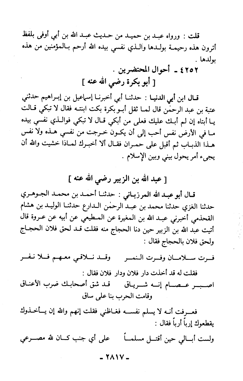 قال أبو عبد الله المرزباني: حدثنا أحمد بن محمد الجوهري حدثنا الغزي حدثنا محمد بن عبد الرحمن الدارع حدثنا الوليد بن هشام القحذمي أخبرني عبد الله بن المغيرة عن المطيعي عن أبيه عن عروة قال أتيت عبد الله بن الزبير حين دنا الحجاج منه فقلت قد لحق فلان الحجاج ولحق فلان بالحجاج فقال: