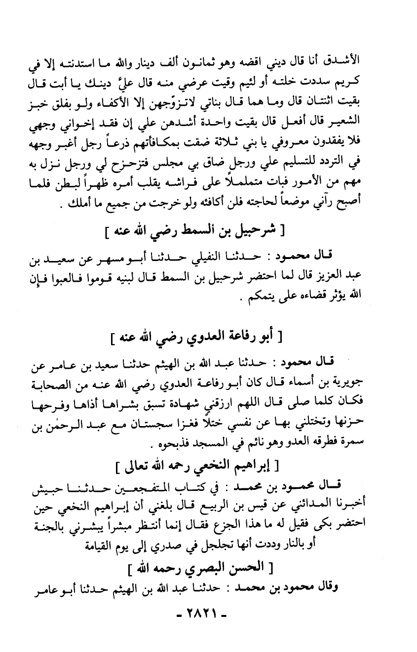 قال محمود: حدثنا عبد الله بن الهيثم حدثنا سعيد بن عامر عن جويرية بن أسماء قال كان أبو رفاعة العدوي رضي الله عنه من الصحابة فكان كلما صلّى قال اللهم ارزقنى شهادة تسبق بشراها أذاها وفرحها حزنها وتختلني بها عن نفسي ختلاً فغزا سجستان مع عبد الرحمن بن سمرة فطرقه العدو وهو نائم في المسجد فذبحوه.