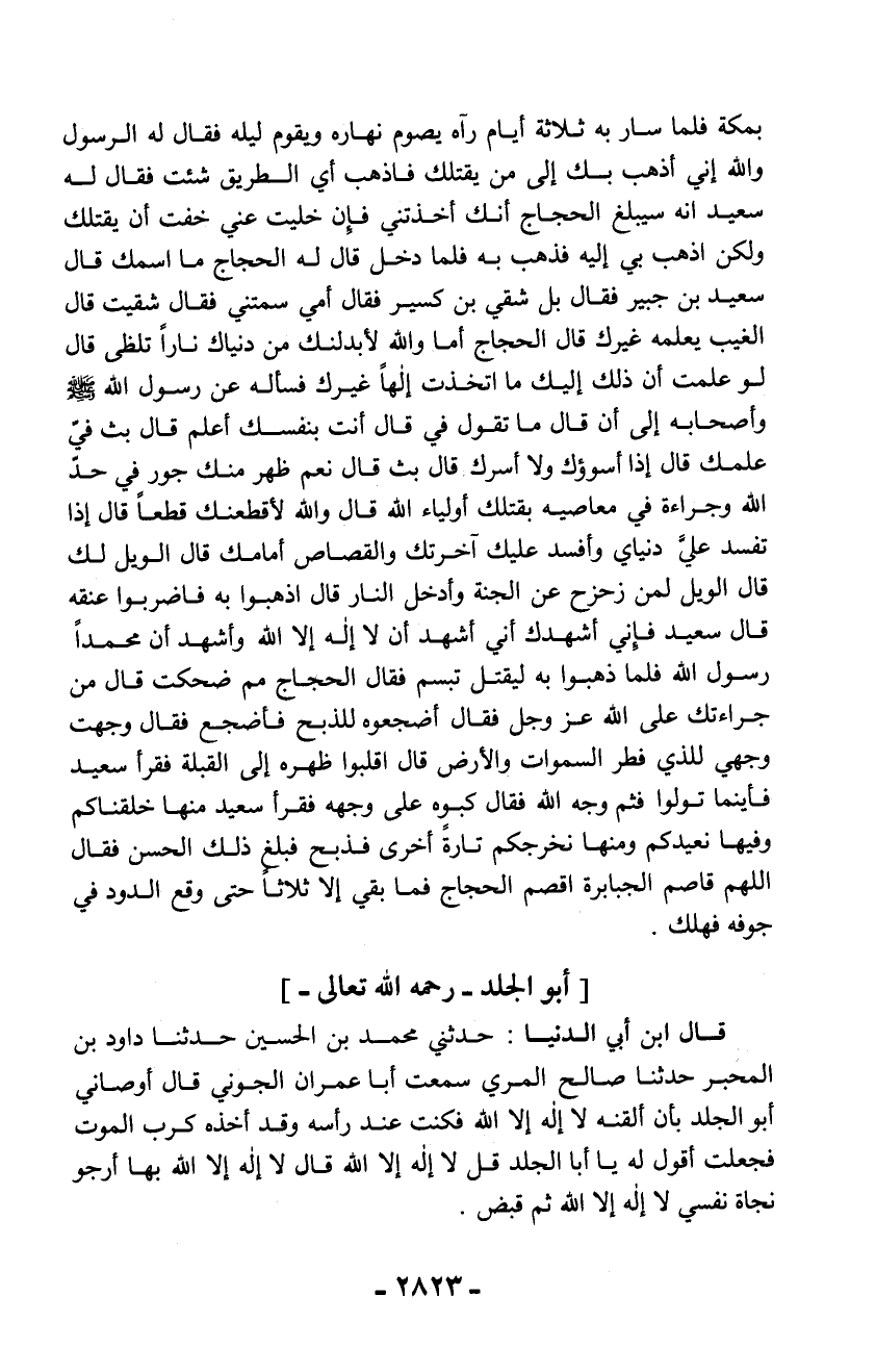 بمكة فلما سار به ثلاثة أيام رآه يصوم نهاره ويقوم ليله فقال له الرسول والله إني أذهب بك إلى من يقتلك فاذهب أي الطريق شئت فقال له سعيد أنه سيبلغ الحجاج أنك أخذتني فإن خليت عني خفت أن يقتلك ولكن اذهب بي إليه فذهب به فلما دخل قال له الحجاج ما اسمك قال سعيد بن جبير فقال بل شقي بن كسير فقال أمي سمتني فقال شقيت قال الغيب يعلمه غيرك قال الحجاج أما والله لأبدلنك من دنياك ناراً تلظى قال لو علمت أن ذلك إليك ما اتخذت إلهاً غيرك فسأله عن رسول الله - صلّى الله عليه وسلم - وأصحابه إلى أن قال ما تقول في قال أنت بنفسك أعلم قال بث فيّ علمك قال إذا أسوؤك ولا أسرك قال بث قال نعم ظهر منك جور في حدّ الله وجراءة في معاصيه بقتلك أولياء الله قال والله لأقطعنك قطعاً قال إذا تفسد عليَّ دنياي وأفسد عليك آخرتك والقصاص أمامك قال الويل لك قال الويل لمن زحزح عن الجنة وأدخل النار قال اذهبوا به فاضربوا عنقه قال سعيد فإني أشهدك أني أشهد أن لا إله إلا الله وأشهد أن محمداً رسول الله فلما ذهبوا به ليقتل تبسم فقال الحجاج مم ضحكت قال من جراءتك على الله عز وجل فقال أضجعوه للذبح فأضجع فقال وجهت وجهي للذي فطر السماوات والأرض قال اقلبوا ظهره إلى القبلة فقرأ سعيد فأينما تولوا فثم وجه الله فقال كبوه على وجهه فقرأ سعيد منها خلقناكم وفيها نعيدكم ومنها نخرجكم تارةً أخرى فذبح فبلغ ذلك الحسن فقال اللهم قاصم الجبابرة اقصم الحجاج فما بقي إلا ثلاثاً حتى وقع الدود في جوفه فهلك.