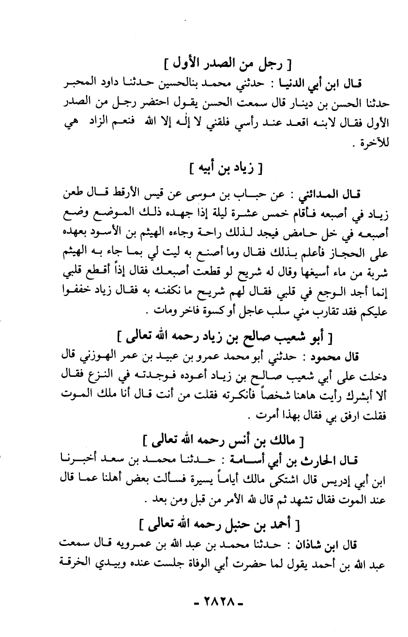 قال ابن أبي الدنيا: حدثني محمد بن الحسين حدثنا داود المحبر حدثنا الحسن بن دينار قال سمعت الحسن يقول احتضر رجل من الصدر الأول فقال لابنه اقعد عند رأسي فلقني لا إله إلا الله فنعم الزاد هي للآخرة.