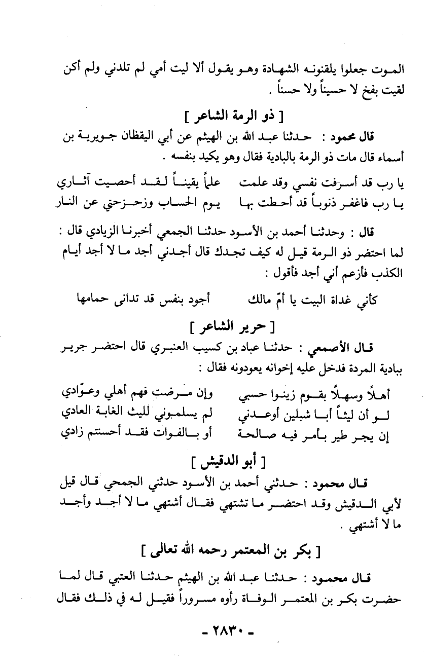 قال: وحدثنا أحمد بن الأسود حدثنا الجمعي أخبرنا الزيادي قال: لما احتضر ذو الرمة قيل له كيف تجدك قال أجدني أجد ما لا أجد أيام الكذب فأزعم أني أجد فأقول: