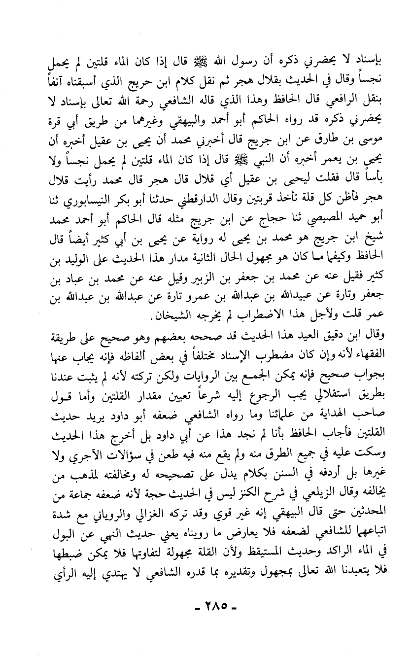 بإسناد لا يحضرني ذكره أن رسول الله - صلى الله عليه وسلم - قال إذا كان الماء قلتين لم يحمل نجساً وقال في الحديث بقلال هجر ثم نقل كلام ابن حريج الذي أسبقناه آنفاً بنقل الرافعي قال الحافظ وهذا الذي قاله الشافعي رحمة الله تعالى بإسناد لا يحضرني ذكره قد رواه الحاكم أبو أحمد والبيهقي وغيرهما من طريق أبي قرة موسى بن طارق عن ابن جريج قال أخبرني محمد أن يحيى بن عقيل أخبره أن يحيى بن يعمر أخبره أن النبي - صلى الله عليه وسلم - قال إذا كان الماء قلتين لم يحمل نجساً ولا بأساً قال فقلت ليحيى بن عقيل أي قلال قال هجر قال محمد رأيت قلال هجر فأظن كل قلة تأخذ قربتين وقال الدارقطني حدثنا أبو بكر النيسابوري ثنا أبو حميد المصيصي ثنا حجاج عن ابن جريج مثله قال الحاكم أبو أحمد محمد شيخ ابن جريج هو محمد بن يحيى له رواية عن يحيى بن أبي كثير أيضاً قال الحافظ وكيفما ما كان هو مجهول الحال الثانية مدار هذا الحديث على الوليد بن كثير فقيل عنه عن محمد بن جعفر بن الزبير وقيل عنه عن محمد بن عباد بن جعفر وتارة عن عبيد الله بن عبد الله بن عمرو تارة عن عبد الله بن عبد الله بن عمر قلت ولأجل هذا الاضطراب لم يخرجه الشيخان.