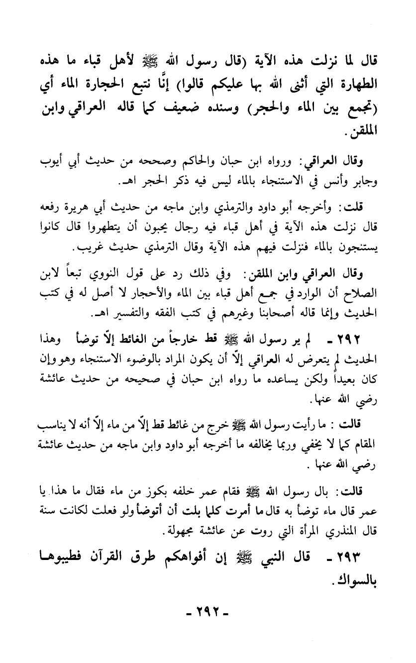 292 - لم ير رسول الله - صلى الله عليه وسلم - قط خارجاً من الغائط إلاّ توضأ وهذا الحديث لم يتعرض له العراقي إلا أن يكون المراد بالوضوء الاستنجاء وهو وإن كان بعيداً ولكن يساعده ما رواه ابن حبان في صحيحه من حديث عائشة رضي الله عنها.