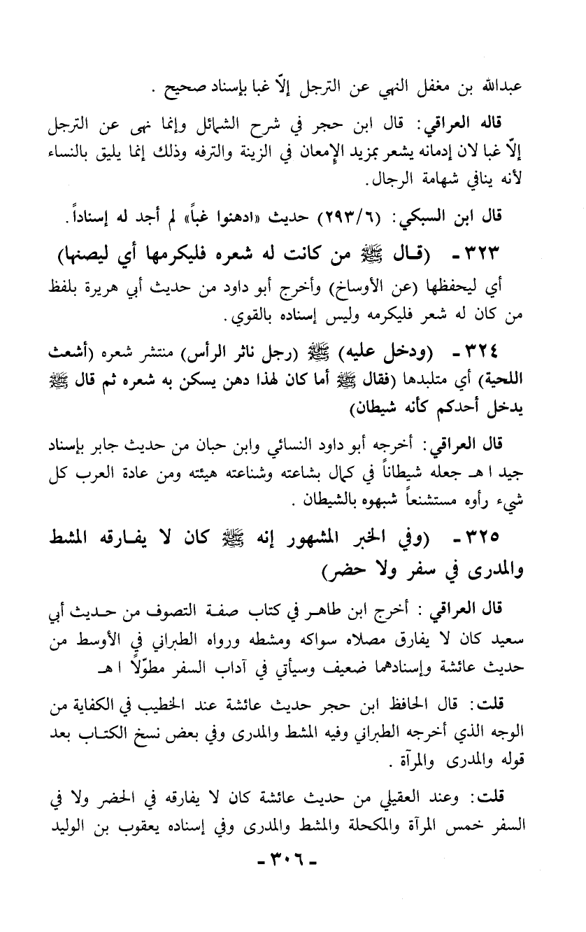 325 - (وفي الخبر المشهور إنه - صلى الله عليه وسلم - كان لا يفارقه المشط والمدرى في سفر ولا حضر)