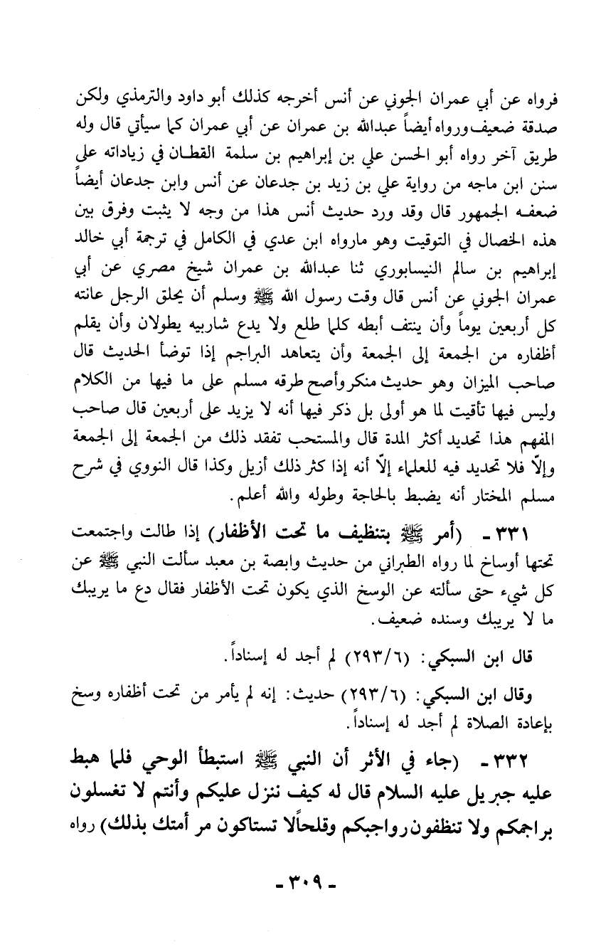 331 - (أمر - صلى الله عليه وسلم - بتنظيف ما تحت الأظفار) إذا طالت واجتمعت تحتها أوساخ لما رواه الطبراني من حديث وابصة بن معبد سألت النبي - صلى الله عليه وسلم - عن كل شيء حتى سألته عن الوسخ الذي يكون تحت الأظفار فقال دع ما يريبك ما لا يريبك وسنده ضعيف.