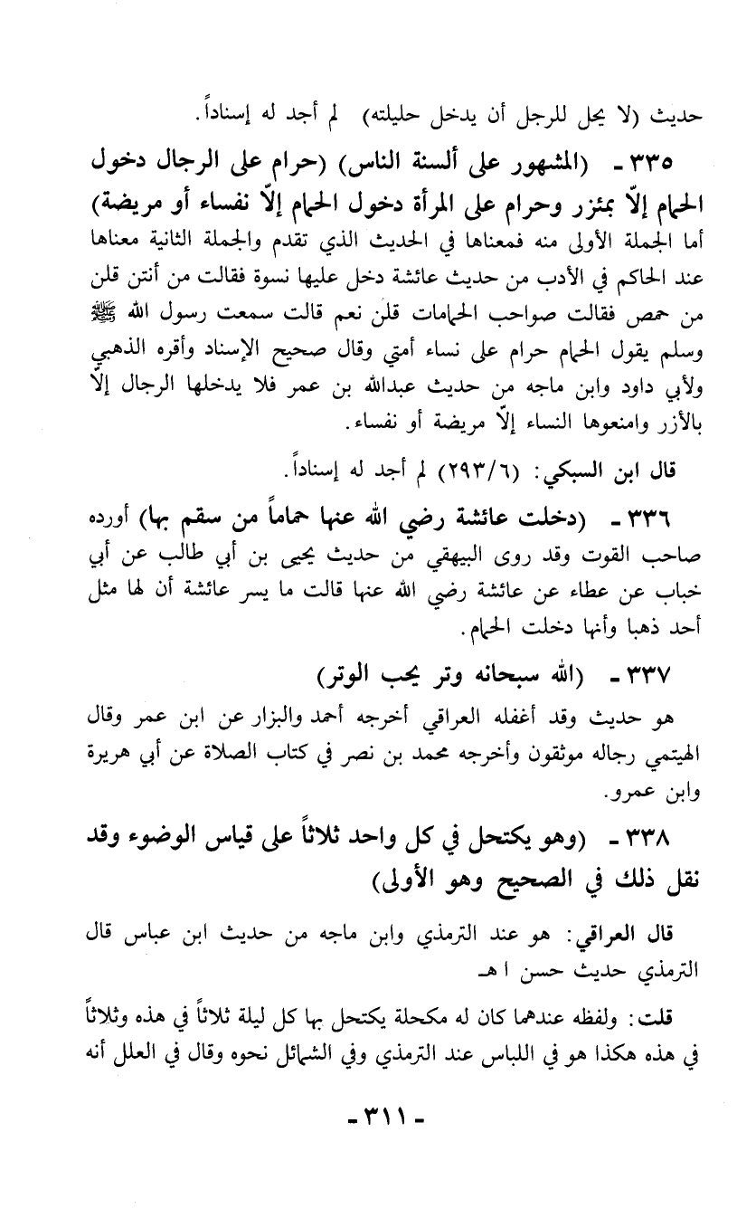 335 - (المشهور على ألسنة الناس) (حرام على الرجال دخول الحمام إلاَّ بمئزر وحرام على المرأة دخول الحمام إلاَّ نفساء أو مريضة) أما الجملة الأولى منه فمعناها في الحديث الذي تقدم والجملة الثانية معناها عند الحاكم في الأدب من حديث عائشة دخل عليها نسوة فقالت من أنتن قلن من حمص فقالت صواحب الحمامات قلن نعم قالت سمعت رسول الله - صلى الله عليه وسلم - وسلم يقول الحمام حرام على نساء أمتي وقال صحيح الإسناد وأقره الذهبي ولأبي داود وابن ماجه من حديث عبد الله بن عمر فلا يدخلها الرجال إلاَّ بالأزر وامنعوها النساء إلاَّ مريضة أو نفساء.