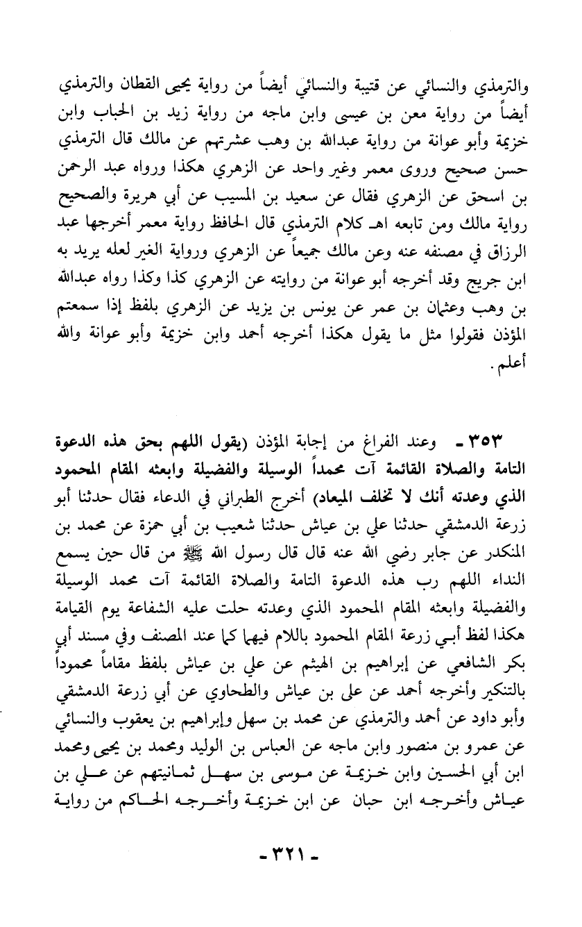 353 - وعند الفراغ من إجابة المؤذن (يقول اللهم بحق هذه الدعوة التامة والصلاة القائمة آت محمداً الوسيلة والفضيلة وابعثه المقام المحمود الذي وعدته أنك لا تخلف الميعاد) أخرج الطبراني في الدعاء فقال حدثنا أبو زرعة الدمشقي حدثنا علي بن عياش حدثنا شعيب بن أبي حمزة عن محمد بن المنكدر عن جابر رضي الله عنه قال قال رسول الله - صلى الله عليه وسلم - من قال حين يسمع النداء اللهم رب هذه الدعوة التامة والصلاة القائمة آت محمد الوسيلة والفضيلة وابعثه المقام المحمود الذي وعدته حلت عليه الشفاعة يوم القيامة هكذا لفظ أبي زرعة المقام المحمود باللام فيهما كما عند المصنف وفي مسند أبي بكر الشافعي عن إبراهيم بن الهيثم عن علي بن عياش بلفظ مقاماً محموداً بالتنكير وأخرجه أحمد عن علي بن عياش والطحاوي عن أبي زرعة الدمشقي وأبو داود عن أحمد والترمذي عن محمد بن سهل وإبراهيم بن يعقوب والنسائي عن عمرو بن منصور وابن ماجه عن العباس بن الوليد ومحمد بن يحيى ومحمد ابن أبي الحسين وابن خزيمة عن موسى بن سهل ثمانيتهم عن علي بن عياش وأخرجه ابن حبان عن ابن خزيمة وأخرجه الحاكم من رواية