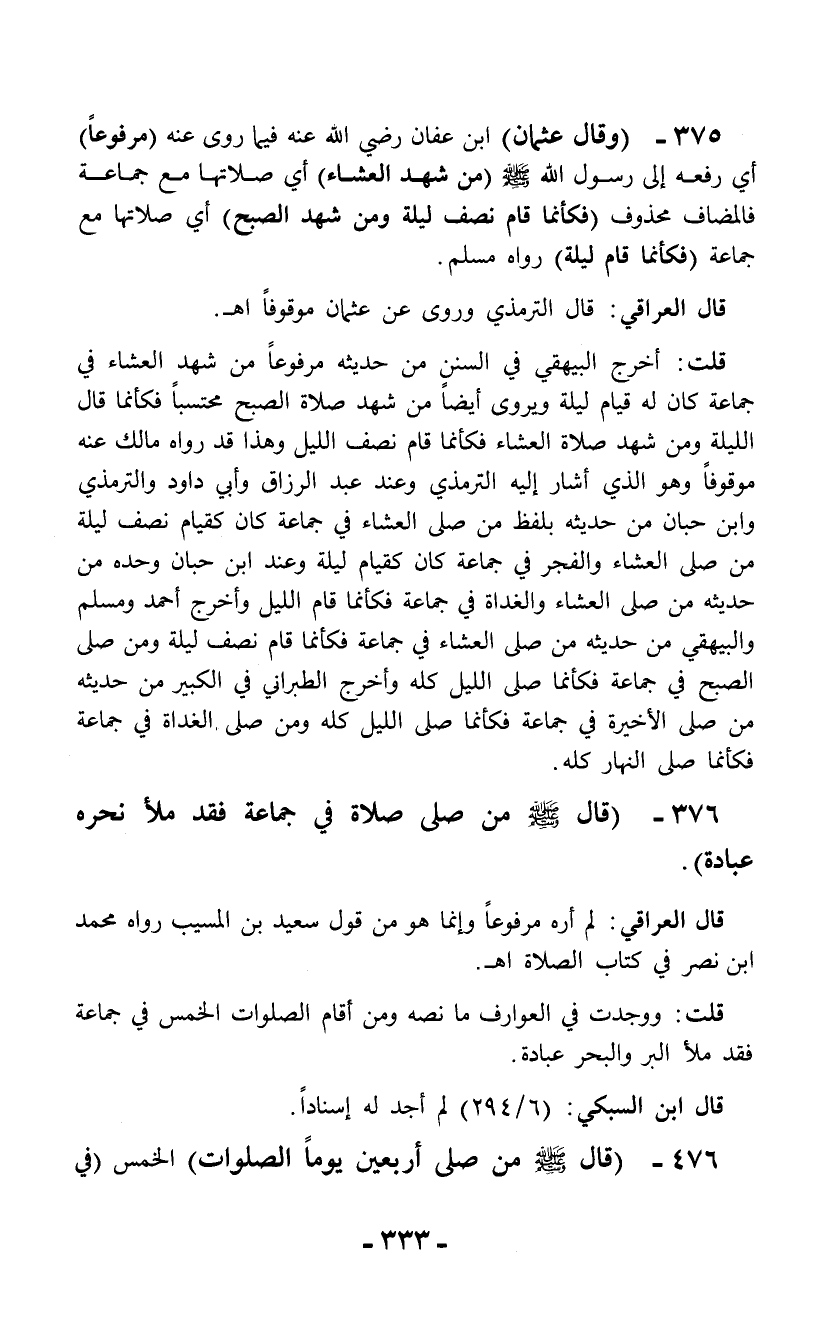 375 - (وقال عثمان) ابن عفان رضي الله عنه فيما روى عنه (مرفوعاً) أي رفعه إلى رسول الله - صلى الله عليه وسلم - (من شهد العشاء) أي صلاتها مع جماعة فالمضاف محذوف (فكأنما قام نصف ليلة ومن شهد الصبح) أي صلاتها مع جماعة (فكأنما قام ليلة) رواه مسلم.