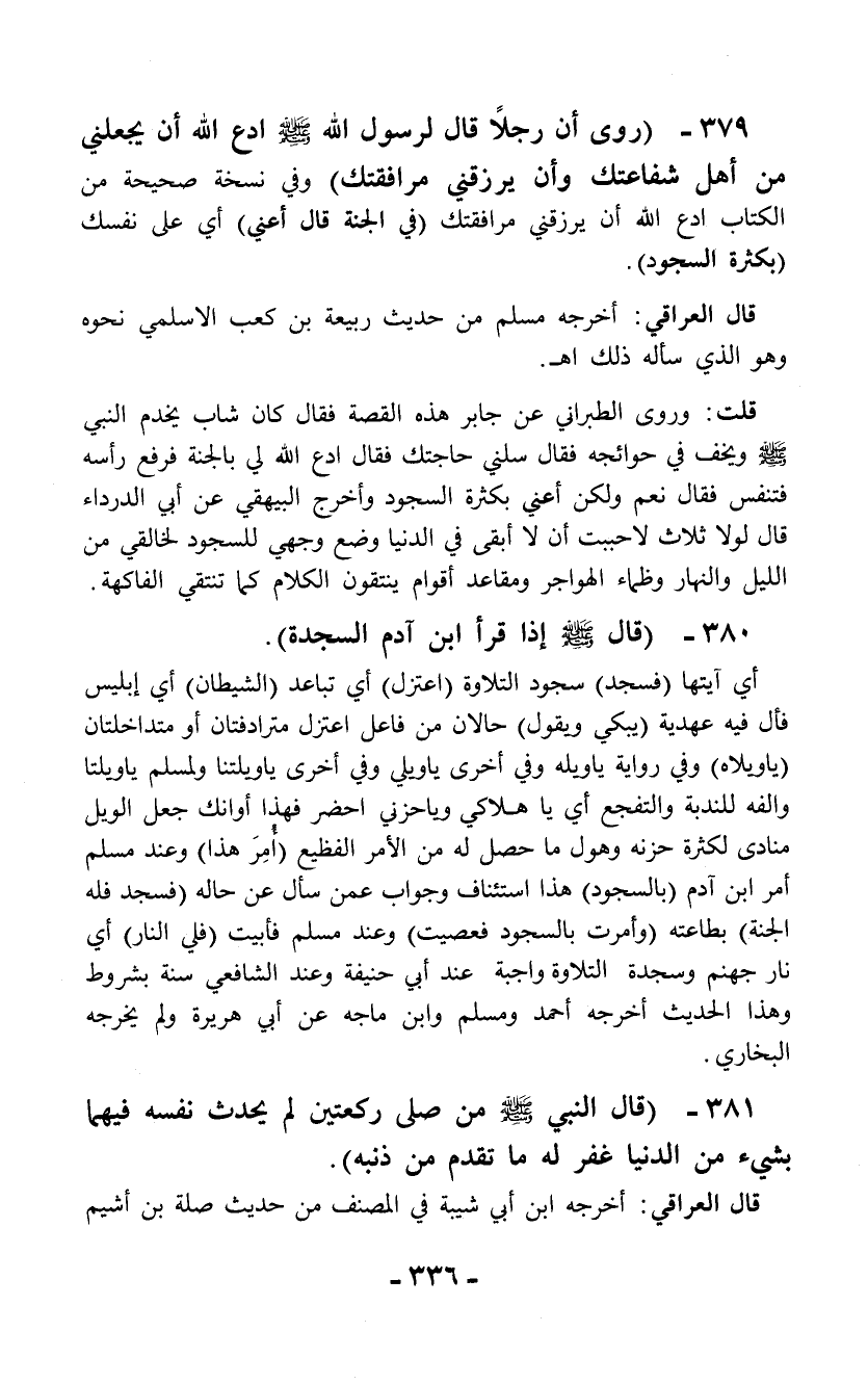 379 - (روى أن رجلاً قال لرسول الله - صلى الله عليه وسلم - ادع الله أن يجعلني من أهل شفاعتك وأن يرزقني مرافقتك) وفي نسخة صحيحة من الكتاب ادع الله أن يرزقني مرافقتك (في الجنة قال أعني) أي على نفسك (بكثرة السجود).
