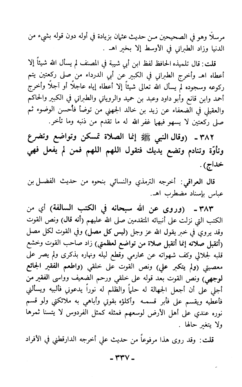 383 - (وروى عن الله سبحانه في الكتب السالفة) أي من الكتب التي نزلت على أنبيائه المتقدمين صلى الله عليهم (أنه قال) ونص القوت وقد يروي في خبر يقول الله عز وجل (ليس كل مصل) وفي القوت لكل مصل (أتقبل صلاته إنما أتقبل صلاة من تواضع لعظمتي) زاد صاحب القوت وخشع قلبه لجلالي وكف شهواته عن محارمي وقطع ليله ونهاره بذكرى ولم يصر على معصيتي (ولم يتكبر علي) ونص القوت على خلقي (واطعم الفقير الجائع لوجهي) ونص القوت بعد قوله على خلقي ورحم الضعيف وواسى الفقير من أجلي على أن أجعل الجهالة له حلماً والظلم له نوراً يدعوني فألبيه ويسألني فأعطيه ويقسم علي فأبر قسمه وأكلؤه بقوتي وأباهي به ملائكتي ولو قسم نوره عندي على أهل الأرض لوسعهم فمثله كمثل الفردوس لا يتسنى ثمرها ولا يتغير حالها.