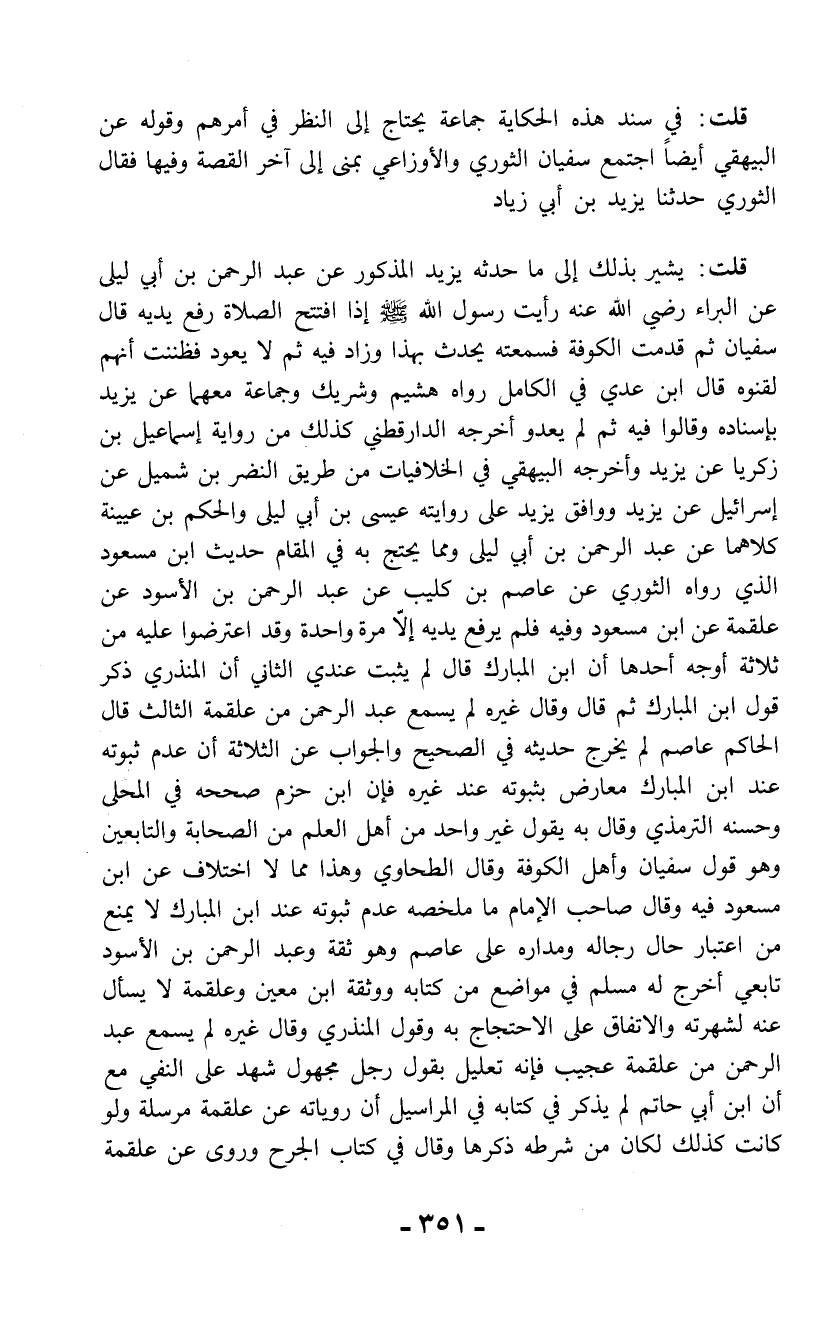 قلت: يشير بذلك إلى ما حدثه يزيد المذكور عن عبد الرحمن بن أبي ليلى عن البراء رضي الله عنه رأيت رسول الله - صلى الله عليه وسلم - إذا افتتح الصلاة رفع يديه قال سفيان ثم قدمت الكوفة فسمعته يحدث بهذا وزاد فيه ثم لا يعود فظننت أنهم لقنوه قال ابن عدي في الكامل رواه هشيم وشريك وجماعة معهما عن يزيد بإسناده وقالوا فيه ثم لم يعدو أخرجه الدارقطني كذلك من رواية إسماعيل بن زكريا عن يزيد وأخرجه البيهقي في الخلافيات من طريق النضر بن شميل عن إسرائيل عن يزيد ووافق يزيد على روايته عيسى بن أبي ليلى والحكم بن عيينة كلاهما عن عبد الرحمن بن أبي ليلى ومما يحتج به في المقام حديث ابن مسعود الذي رواه الثوري عن عاصم بن كليب عن عبد الرحمن بن الأسود عن علقمة عن ابن مسعود وفيه فلم يرفع يديه إلاَّ مرة واحدة وقد اعترضوا عليه من ثلاثة أوجه أحدها أن ابن المبارك قال لم يثبت عندي الثاني أن المنذري ذكر قول ابن المبارك ثم قال وقال غيره لم يسمع عبد الرحمن من علقمة الثالث قال الحاكم عاصم لم يخرج حديثه في الصحيح والجواب عن الثلاثة أن عدم ثبوته عند ابن المبارك معارض بثبوته عند غيره فإن ابن حزم صححه في المحلى وحسنه الترمذي وقال به يقول غير واحد من أهل العلم من الصحابة والتابعين وهو قول سفيان وأهل الكوفة وقال الطحاوي وهذا مما لا اختلاف عن ابن مسعود فيه وقال صاحب الإمام ما ملخصه عدم ثبوته عند ابن المبارك لا يمنع من اعتبار حال رجاله ومداره على عاصم وهو ثقة وعبد الرحمن بن الأسود تابعي أخرج له مسلم في مواضع من كتابه ووثقة ابن معين وعلقمة لا يسأل عنه لشهرته والاتفاق على الاحتجاج به وقول المنذري وقال غيره لم يسمع عبد الرحمن من علقمة عجيب فإنه تعليل بقول رجل مجهول شهد على النفي مع أن ابن أبي حاتم لم يذكر في كتابه في المراسيل أن روياته عن علقمة مرسلة ولو كانت كذلك لكان من شرطه ذكرها وقال في كتاب الجرح وروى عن علقمة