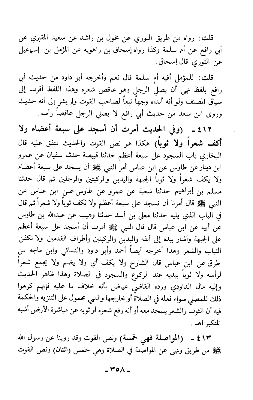 412 - (وفي الحديث أمرت أن أسجد على سبعة أعضاء ولا أكف شعراً ولا ثوباً) هكذا هو نص القوت والحديث متفق عليه قال البخاري باب السجود على سبعة أعظم حدثنا قبيصة حدثنا سفيان عن عمرو ابن دينار عن طاوس عن ابن عباس أمر النبي - صلى الله عليه وسلم - أن يسجد على سبعة أعضاء ولا يكف شعراً ولا ثوباً الجبهة واليدين والركبتين والرجلين ثم قال حدثنا مسلم بن إبراهيم حدثنا شعبة عن عمرو عن طاوس عن ابن عباس عن النبي - صلى الله عليه وسلم - قال أمرنا أن نسجد على سبعة أعظم ولا نكف ثوباً ولا شعراً ثم قال في الباب الذي يليه حدثنا معلى بن أسد حدثنا وهيب عن عبد الله بن طاوس عن أبيه عن ابن عباس قال قال النبي - صلى الله عليه وسلم - أمرت أن أسجد على سبعة أعظم على الجبهة وأشار بيده إلى أنفه واليدين والركبتين وأطراف القدمين ولا نكفن الثياب والشعر وهذا أخرجه أيضاً أحمد وأبو داود والنسائي وابن ماجه من طرق عن ابن عباس قال الشارح ولا يكف أي ولا يضم ولا يجمع شعراً لرأسه ولا ثوباً بيديه عند الركوع والسجود في الصلاة وهذا ظاهر الحديث وإليه مال الداودي ورده القاضي عياض بأنه خلاف ما عليه فإنهم كرهوا ذلك للمصلي سواء فعله في الصلاة أو خارجها والنهي محمول على التنزيه والحكمة فيه أن الثوب والشعر يسجد معه أو أنه رفع شعره أوثوبه عن مباشرة الأرض أشبه المتكبر اهـ.